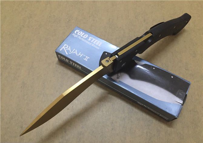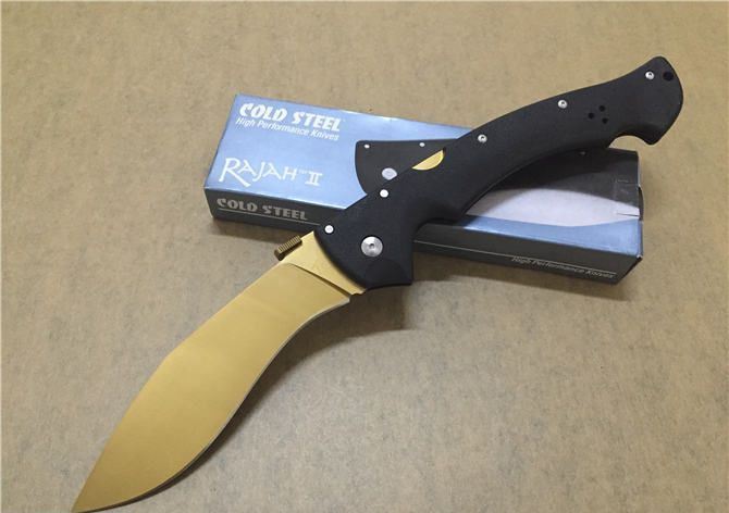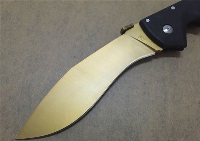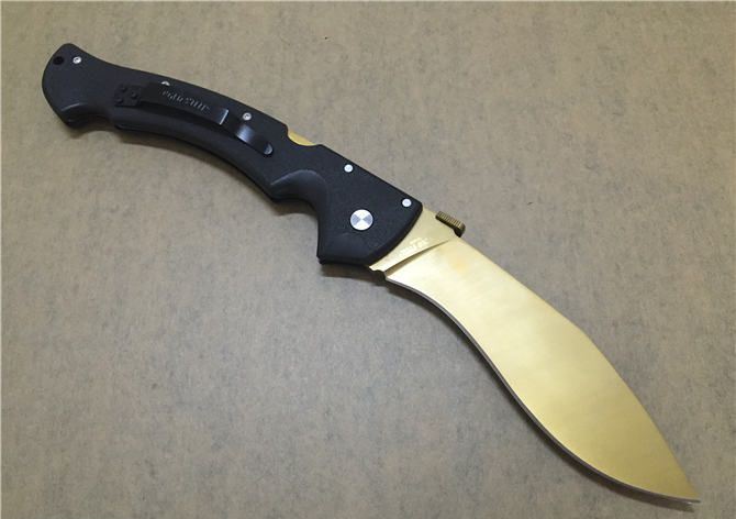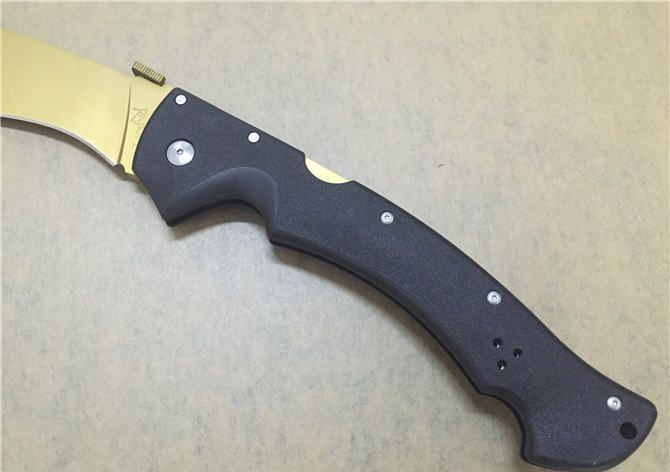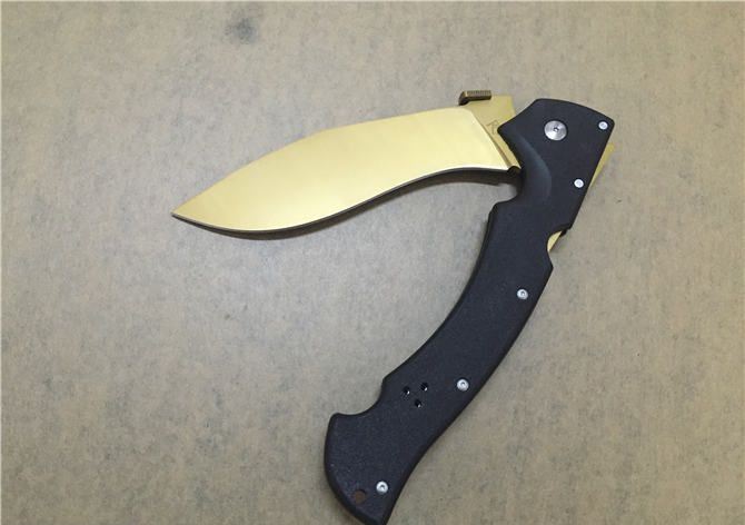 冷钢折叠大狗腿62KG(土豪金) 全长: 35.7 刃长: 15.5 刃宽: 4.1 厚度: 0.4 柄材: Kraton 锁型: 背锁 颜色: 镀钛金 材料: 7Cr 硬度: 58