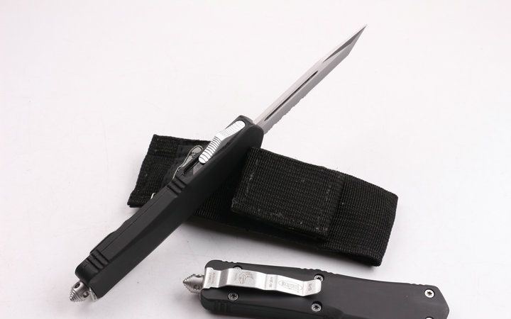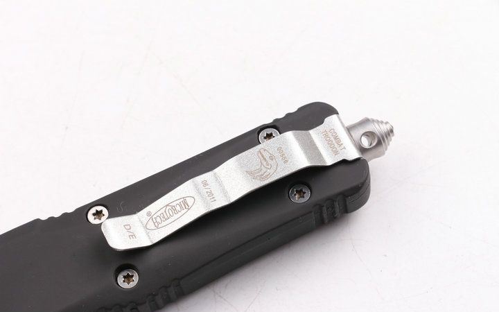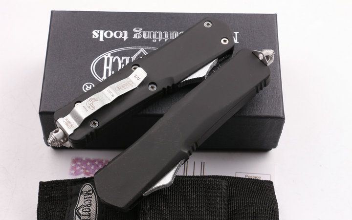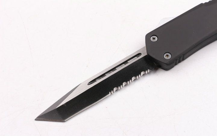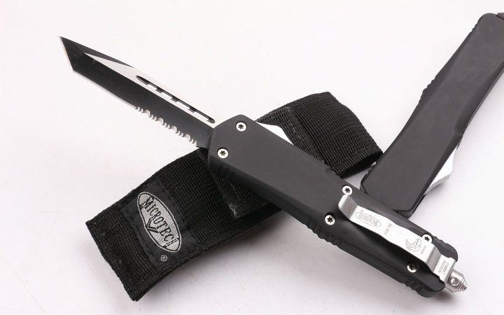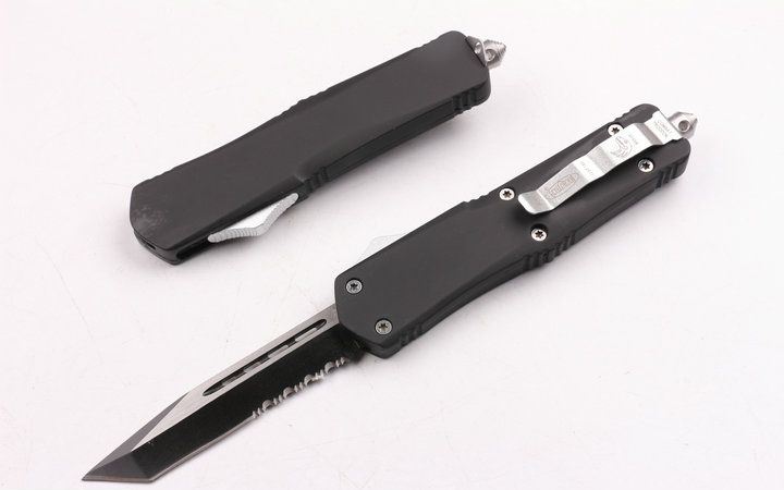 微技术A07伤齿龙单锋半齿黑白刃(T头) 全 长: 23.0cm (含尾锥长度) 刃 长: 9.0cm 刃 厚: 3mm 刃 材: 440 硬 度: 57HRC 刀净重:230.0克 总重量: 350.0克(含包装物) 表 面: 黑白(刀刃) 柄 材: 锌铝合金 刀 鞘: 尼龙 锁 闭: 弹簧直出 备 注: 带背夹和玻璃撞针
