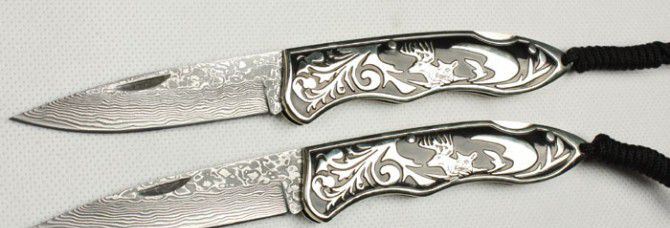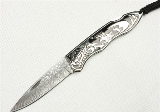 密林版大马士革折刀 全 长: 19.7cm 刃 长: 8.5cm 刃 宽: 2.cm(最宽处) 闭 合: 11cm 刃 材: 进口大马士革钢 硬 度: 59 表 面: 大马士革钢特有的花纹原色 刃 厚: 0.29cm 柄 材: 白铜 重 量: 125克 锁 闭: 传统式制尾锁 其 他: 刃口锋利,配皮套 大马士革钢花纹和把手木纹及颜色各异,以实物为准