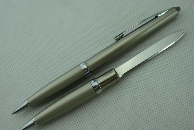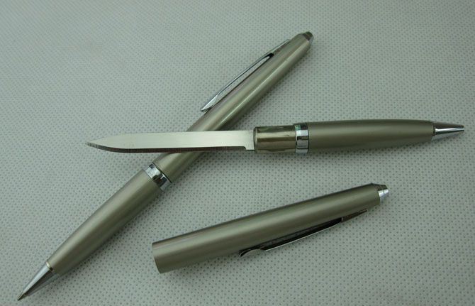 002多功能圆珠笔刀(香槟色) 功能一:小刀(女子防身) 功能二:开信刀 功能三:圆珠笔 全长:13.5CM 净重:20.0克 在拔出小刀时请小心! 笔杆材料:铜