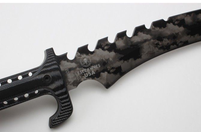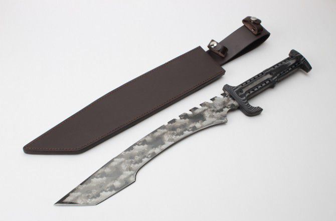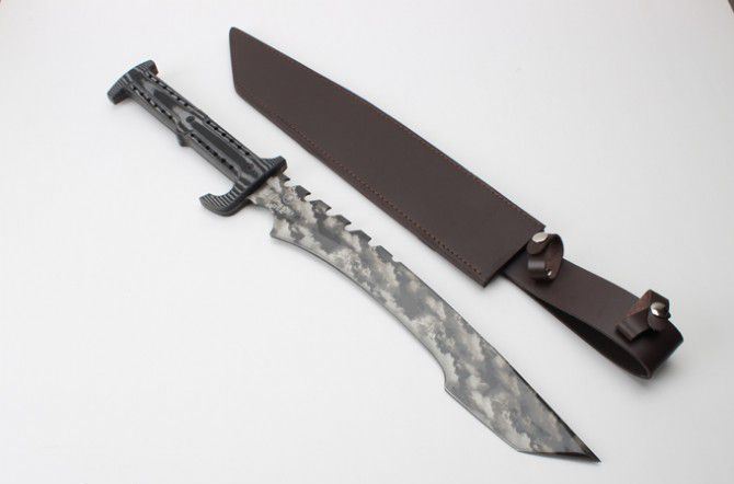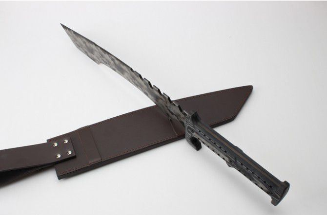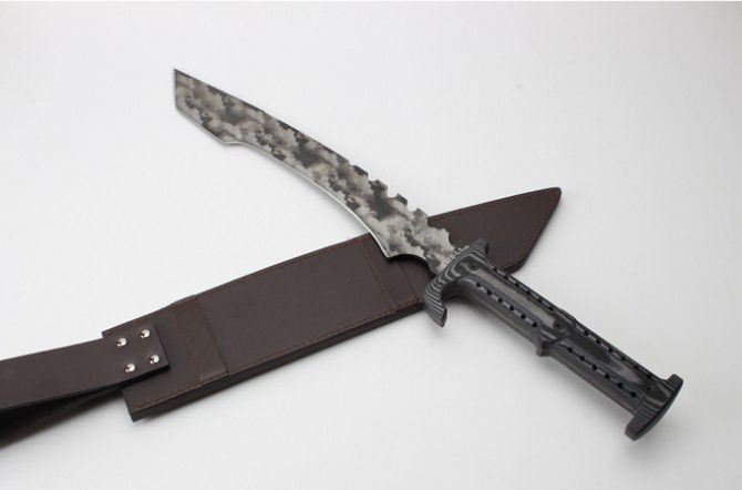 美国丛林探险者砍刀 全 长:602mm 刃 长:401mm 柄 长:313mm 刃 宽:58mm 刃 厚:48mm 刃 材:7Cr13Mov 重 量:1704g(含包装) 硬 度:57HRC 表 面:火练煅纹 柄 材:米克塔,龙骨一体结构 锁 型:定锁 其 他:配牛皮套和黑色硬纸盒