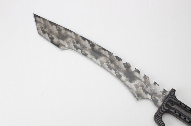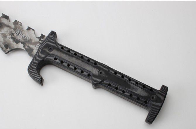 全 长:602mm 刃 长:401mm 柄 长:313mm 刃 宽:58mm 刃 厚:48mm 刃 材:7Cr13Mov 重 量:1704g(含包装) 硬 度:57HRC 表 面:火练煅纹 柄 材:米克塔,龙骨一体结构 锁 型:定锁