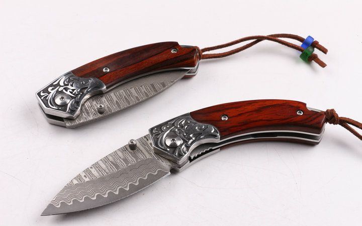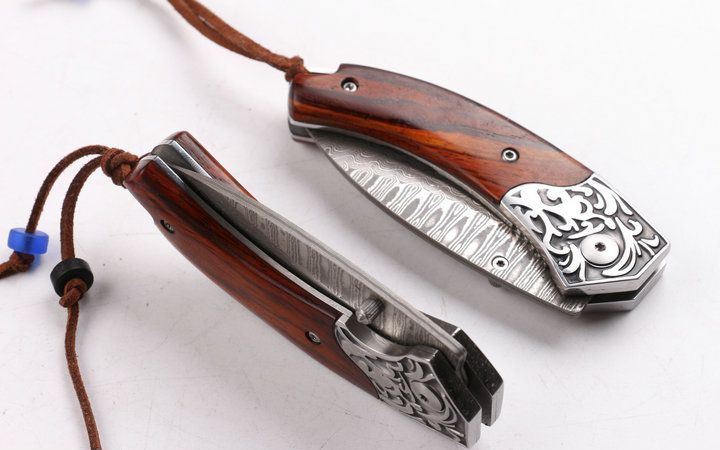 雄风大马士革原大马纹折刀 全 长:15.5Cm 刃 长:6.6Cm 柄 长:9.1Cm 刃 宽:2.8Cm 刃 厚:2.5mm 刃 材:大马士革钢 重 量:200g (含包装) 硬 度:58-60HRC 表 面:原大马士革纹 柄 材:天然黄檀手柄,木纹纹路清楚 锁 型:线锁