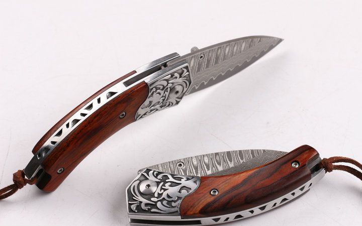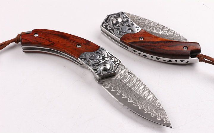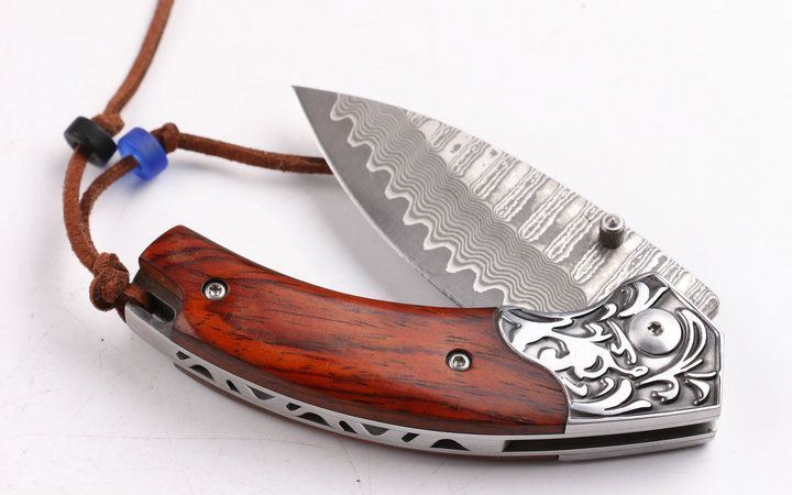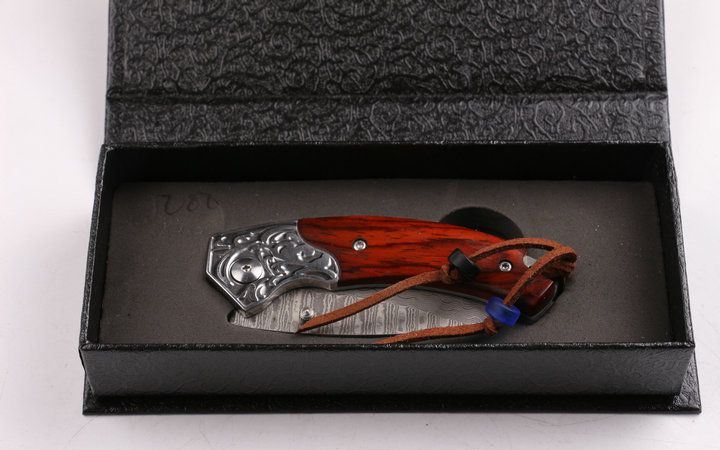 雄风大马士革原大马纹折刀 全 长:15.5Cm 刃 长:6.6Cm 柄 长:9.1Cm 刃 宽:2.8Cm 刃 厚:2.5mm 刃 材:大马士革钢 重 量:200g (含包装) 硬 度:58-60HRC 表 面:原大马士革纹 柄 材:天然黄檀手柄,木纹纹路清楚 锁 型:线锁 其 它:高级礼品盒