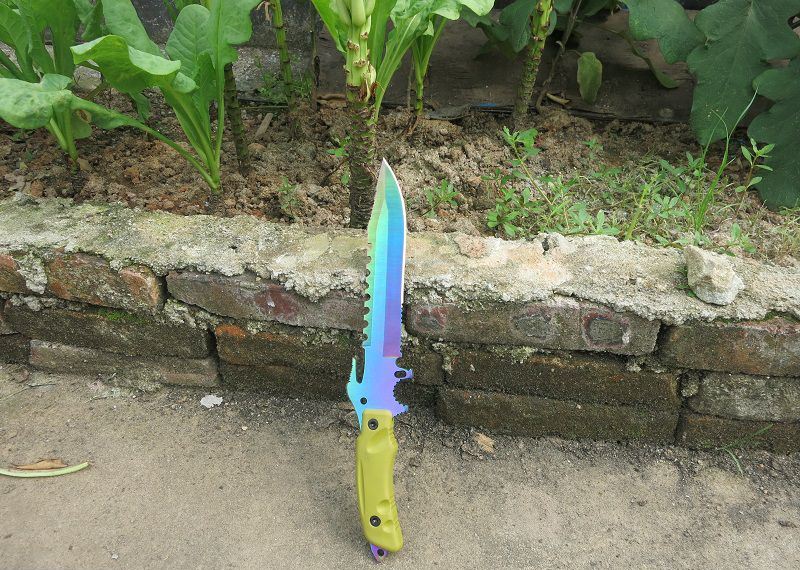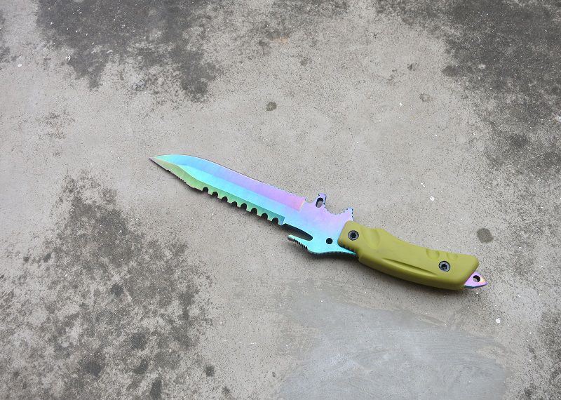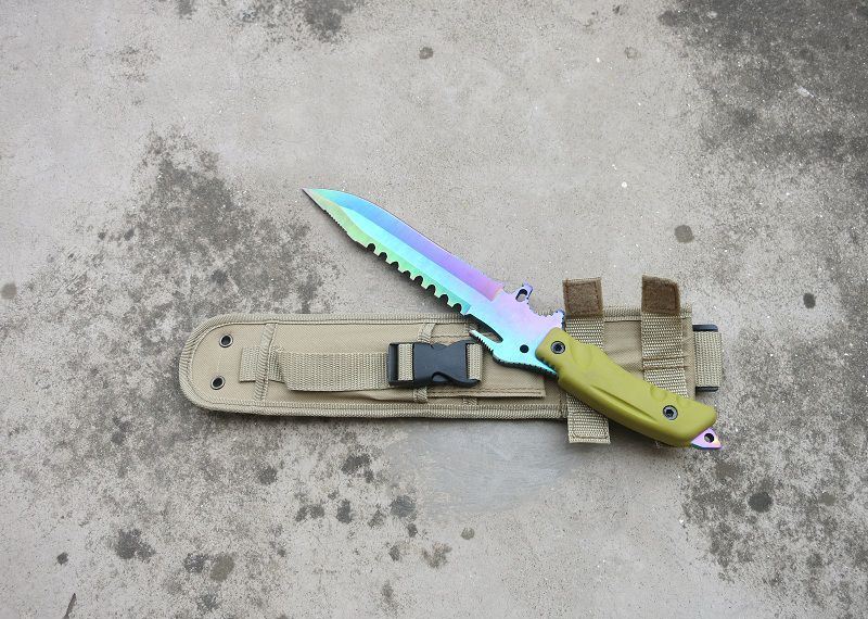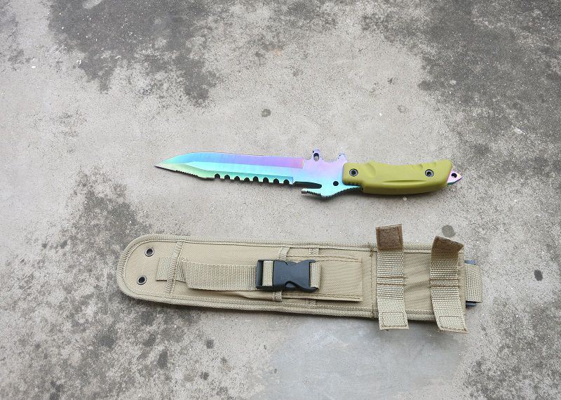 彩钛夜魔911直刀 全 长:355mm 刃 长:180mm 柄 长:130mm 刃 宽:35mm 刃 厚:6.3mm 刃 材:5Cr13Mov 重 量:520g(含包装) 硬 度:57HRC 表 面:彩钛 锁 型:定锁