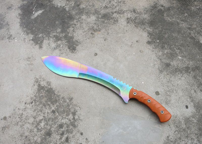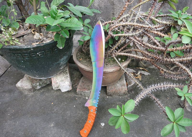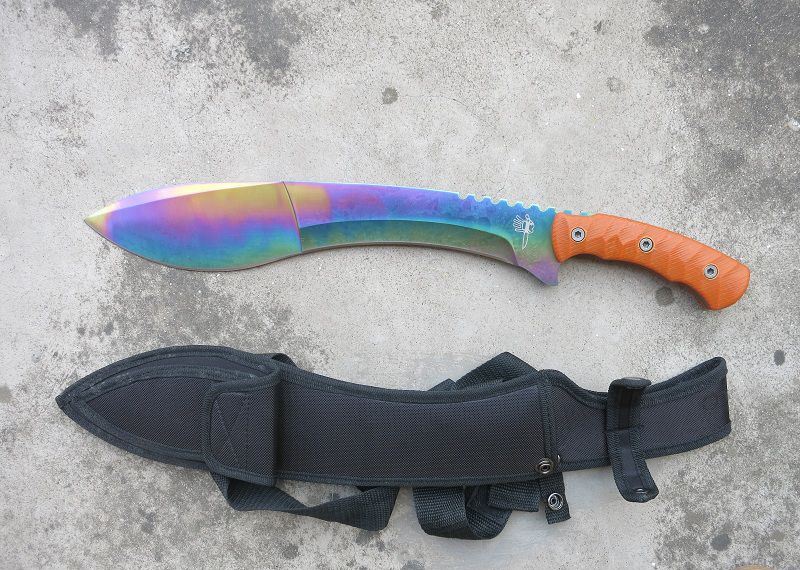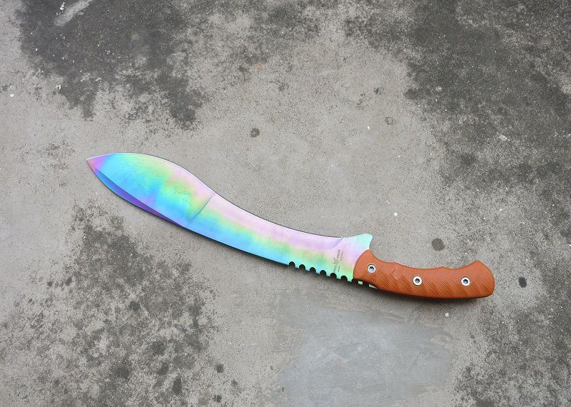 彩钛狐狸FOX大狗腿刀 全 长:50cm 刃 长:46cm 刃 宽:7cm(最宽处) 刃 厚:6.2mm 柄 长:13cm 表 面: 彩钛 刃 材: 5Cr15 硬 度: 58HRC 柄 材: G10防滑柄片 结 构:龙骨一体贯穿整体