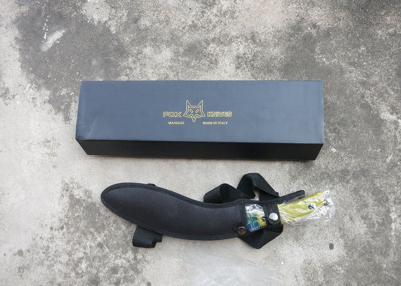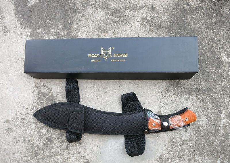 彩钛狐狸FOX大狗腿刀 全 长:50cm 刃 长:46cm 刃 宽:7cm(最宽处) 刃 厚:6.2mm 柄 长:13cm 表 面: 彩钛 刃 材: 5Cr15 硬 度: 58HRC 柄 材: G10防滑柄片 结 构:龙骨一体贯穿整体 包 装:尼农套+彩盒