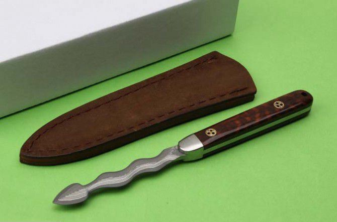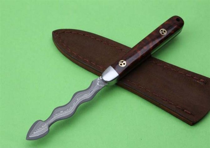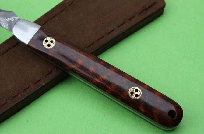 蛇形大马士革茶刀 刃材:日本进口大马士革钢 刃长:76mm 未开刃 柄长: 93mm 全长:168mm 大马士革花纹和把手木纹及颜色各异,以实物为准