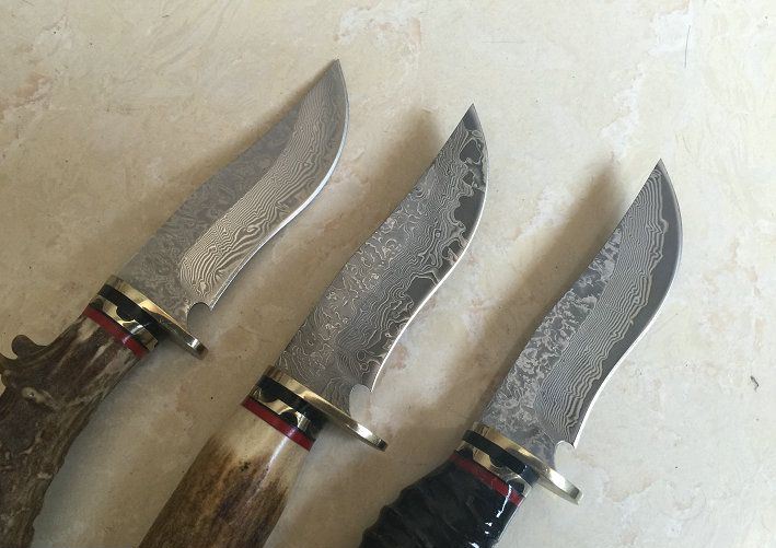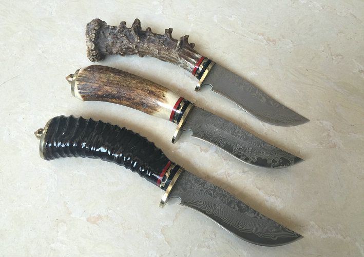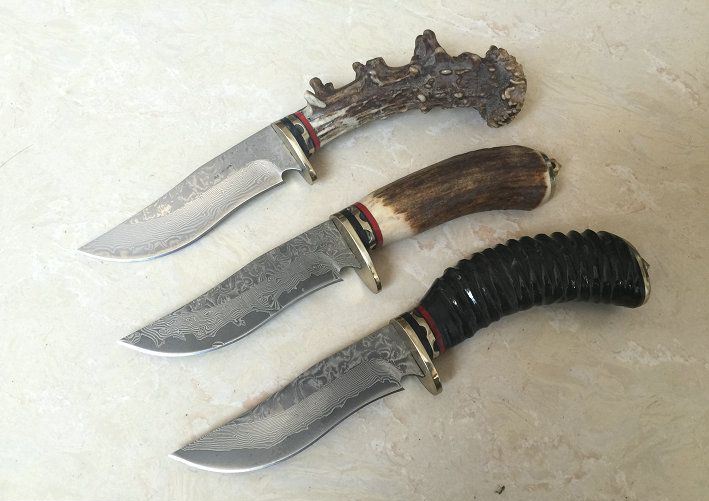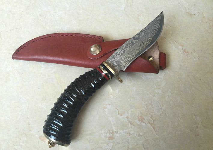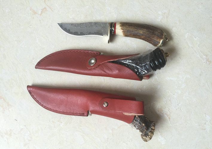 特价经典大马士革收藏猎刀 全 长: 21.5cm 刃 长: 9.8cm 刃 宽: 2.4cm(最宽处) 硬 度: 58-60HRC 刃 厚: 0.2cm 柄 材:天然鹿角或天然羊角 重 量: 200克(含包装) 刃 材: 大马士革钢 表 面: 大马士革钢特有的花纹原色 其 他: 刃口锋利,真皮套