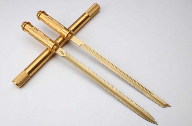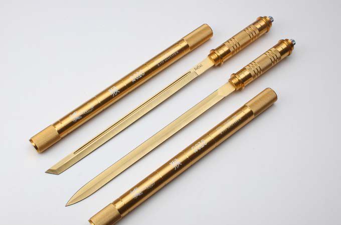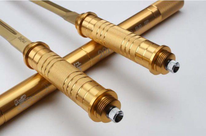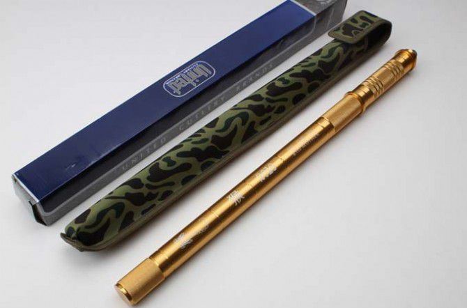 2016猴年土豪金棍刀带灯 完全反接长度:95.5CM 刃长:39CM 完全正合长度:57.5CM 管径:3.2CM 刀厚:0.46CM 刃宽: 2.2CM 重量: 1000g 硬度: 56HRC 刀材质:5Cr13Wov 管材: 铝管 柄材: 合金