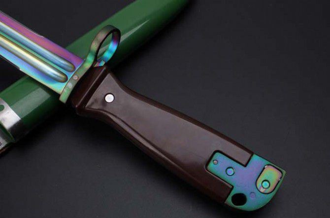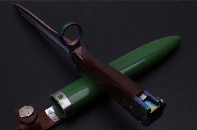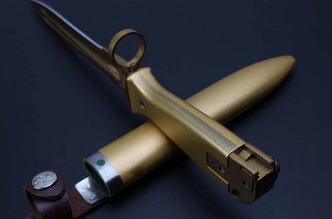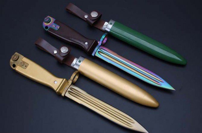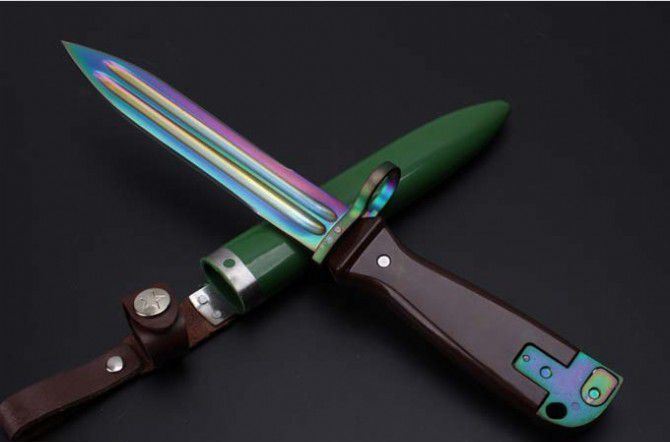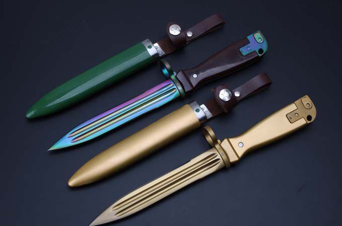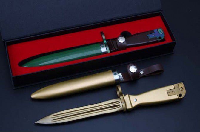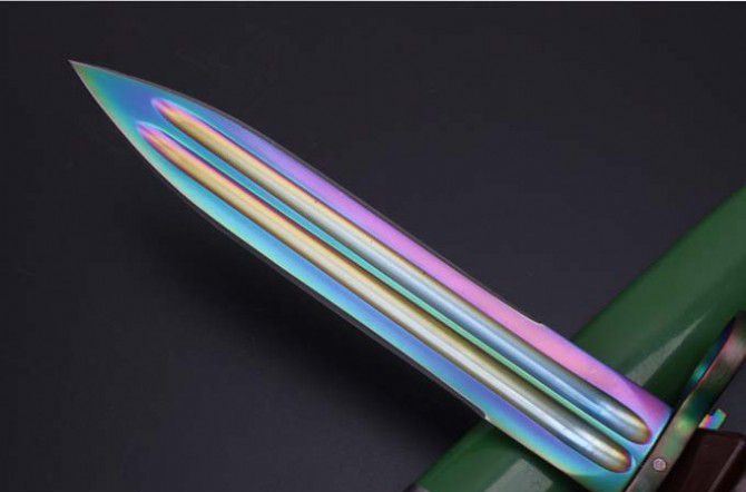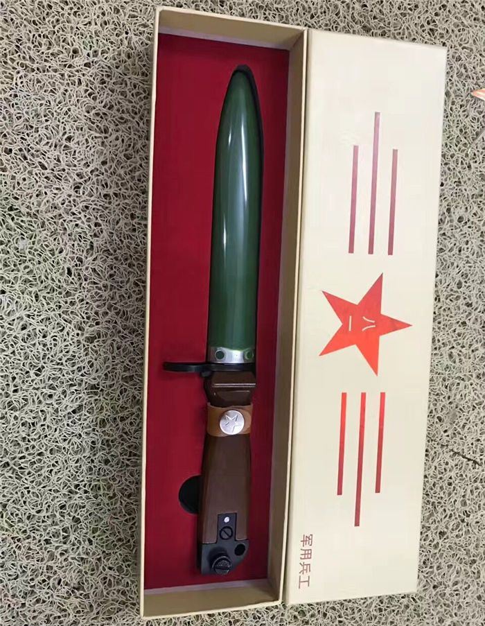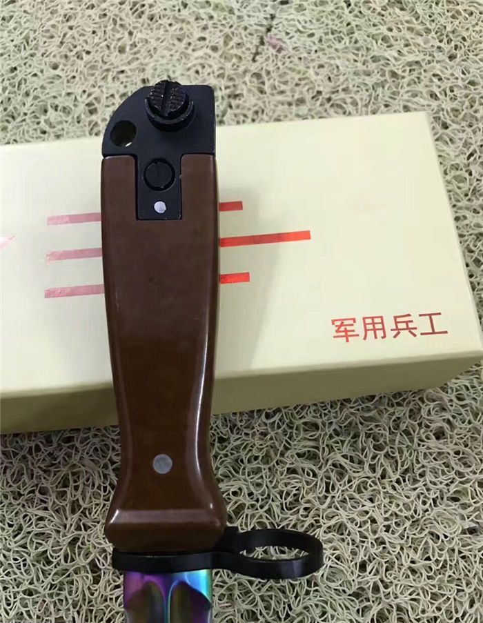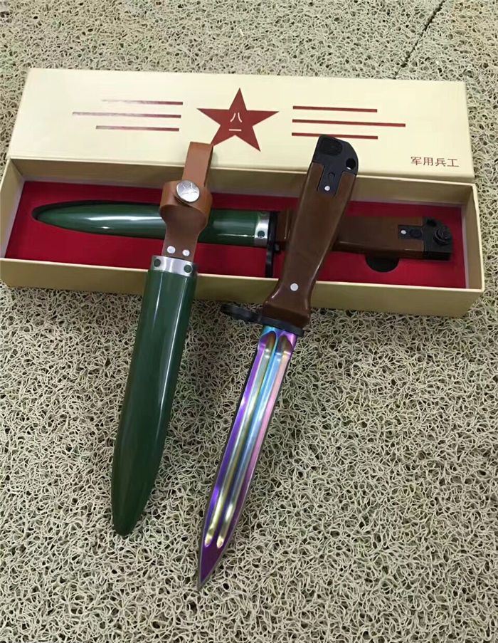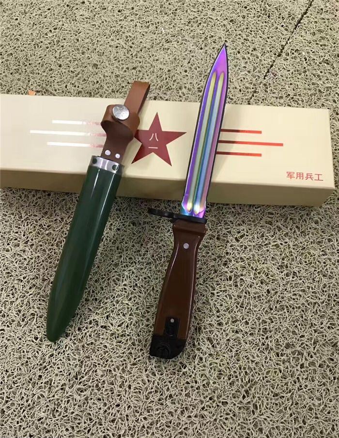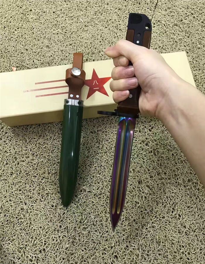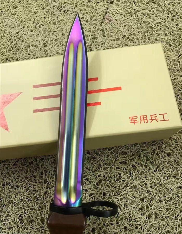 八一军剌幻彩、土豪金版 全 长:29.8cm 柄 长:12.8cm 刃 长:17cm 刃 宽:2.3cm 刃 厚:12mm 硬 度:60HRC 表 面:黄金色/彩钛 刃 材:军用钵 鞘 材:军用ABS 柄 材:电木+钢 总 重:320g