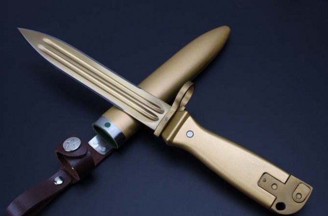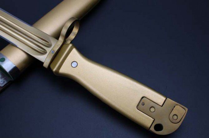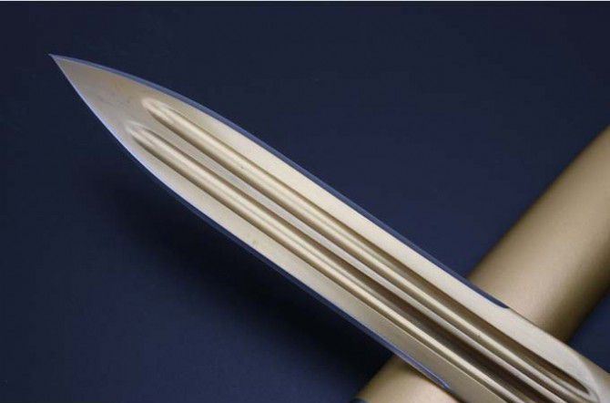 全 长:29.8cm 柄 长:12.8cm 刃 长:17cm 刃 宽:2.3cm 刃 厚:12mm 硬 度:60HRC 表 面:黄金色/彩钛 刃 材:军用钵 鞘 材:军用ABS 柄 材:电木+钢 总 重:320g