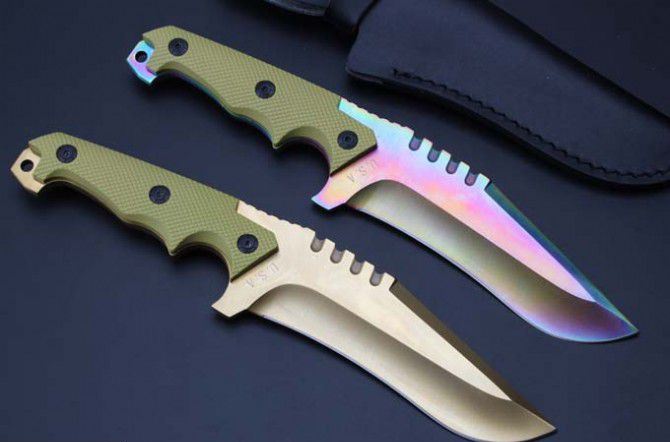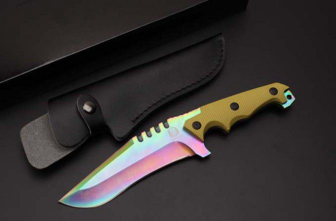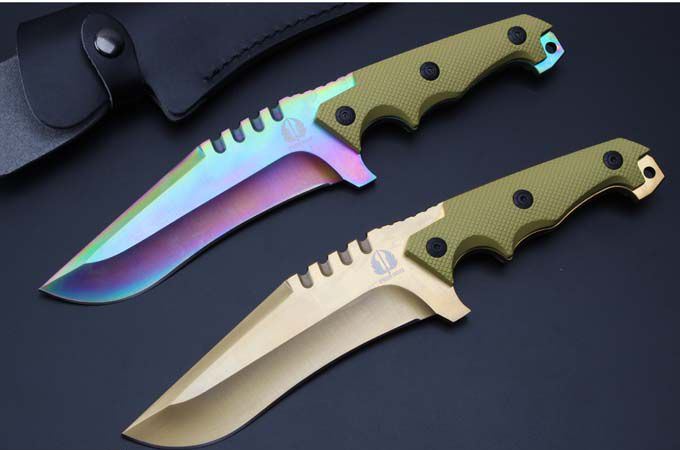 海军陆战队沙漠战鹰 (彩钛、金色) 全长:29.0CM 刃长:16CM 刃厚:0.7CM 刃宽:5.0CM 刃材:9CR18钼 硬度:58HRC 重量:725g仓包装 柄材:G10 刀鞘:牛皮套+彩盒