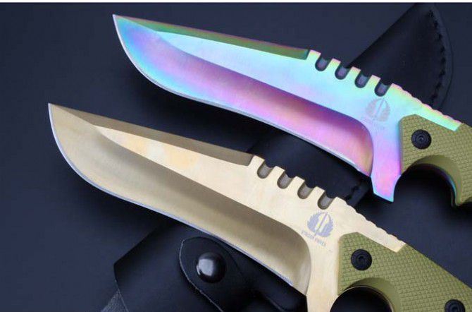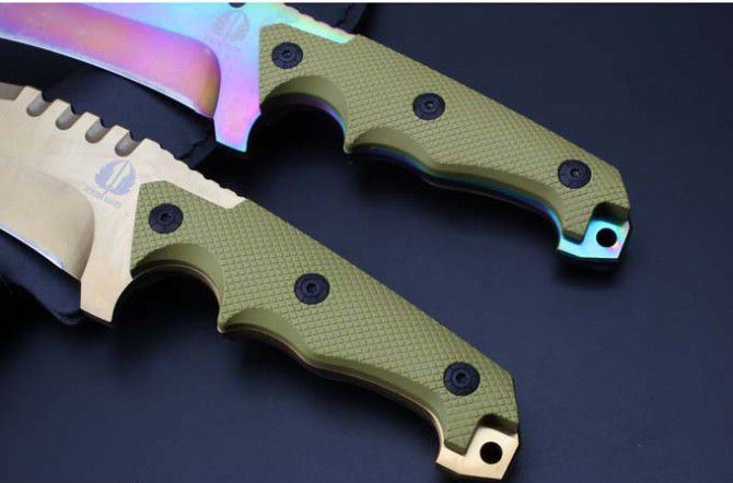 海军陆战队沙漠战鹰 (彩钛、金色) 全长:29.0CM 刃长:16CM 刃厚:0.7CM 刃宽:5.0CM 刃材:9CR18钼 硬度:58HRC 重量:725g仓包装 柄材:G10