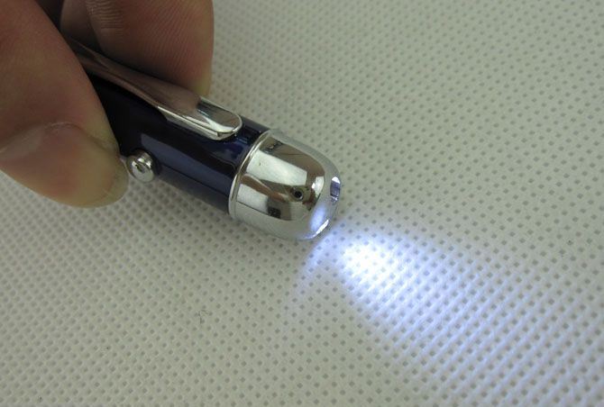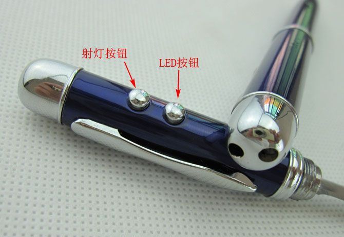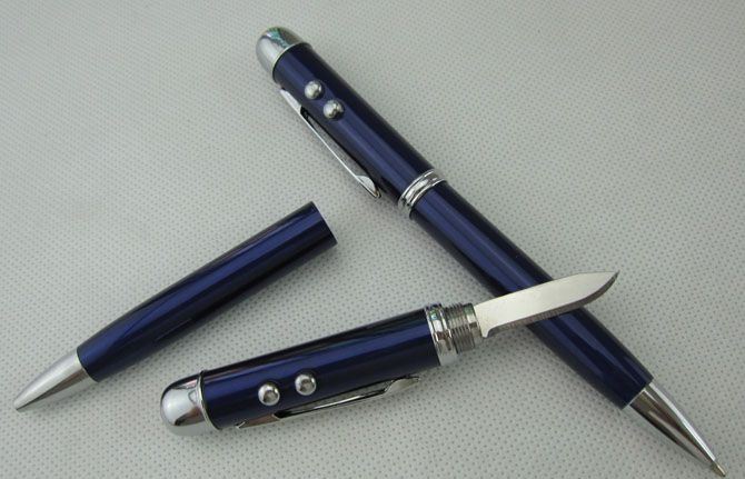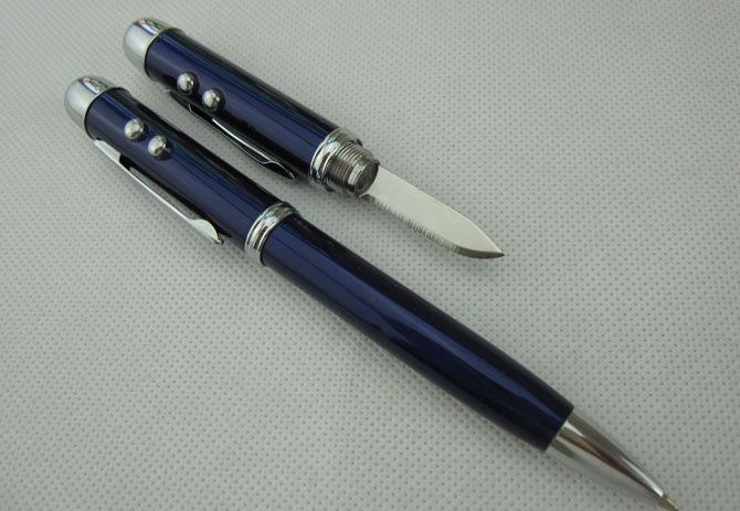 非常实用的时尚礼品:多功能刀笔. 功能一:小刀(女子防身) 功能二:开信刀 功能三:圆珠笔 功能四:照明和射灯(可作远距离教鞭使用) 全长:14.5CM 净重:40.0克 笔杆材料:铜 带LED和射灯