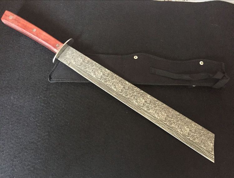 大马纹刀王方头砍刀 全 长:645mm 刃 长:450mm 柄 长:190mm 刃 宽:52mm 刃 厚:5mm 刃 材:5Cr13Wov 硬 度:57HRC 表 面:大马纹 柄 材:红木 锁 型:定锁 其 他:配布套