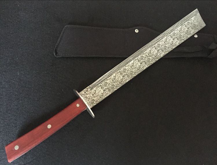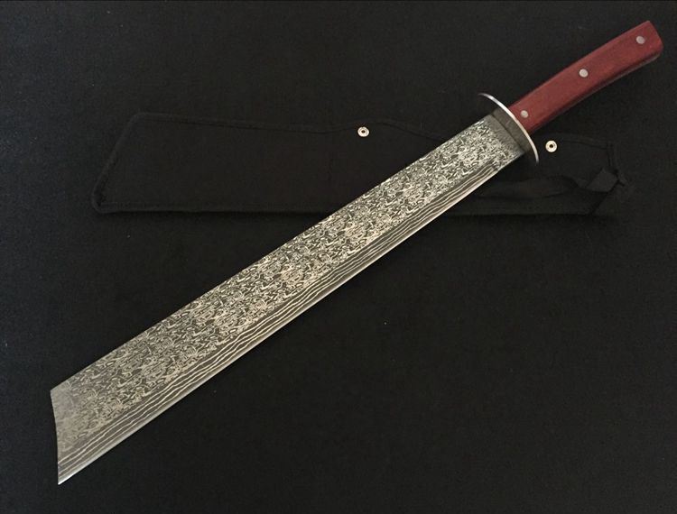 大马纹刀王方头砍刀 全 长:645mm 刃 长:450mm 柄 长:190mm 刃 宽:52mm 刃 厚:5mm 刃 材:5Cr13Wov 硬 度:57HRC 表 面:大马纹 柄 材:红木 锁 型:定锁
