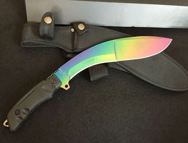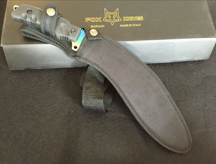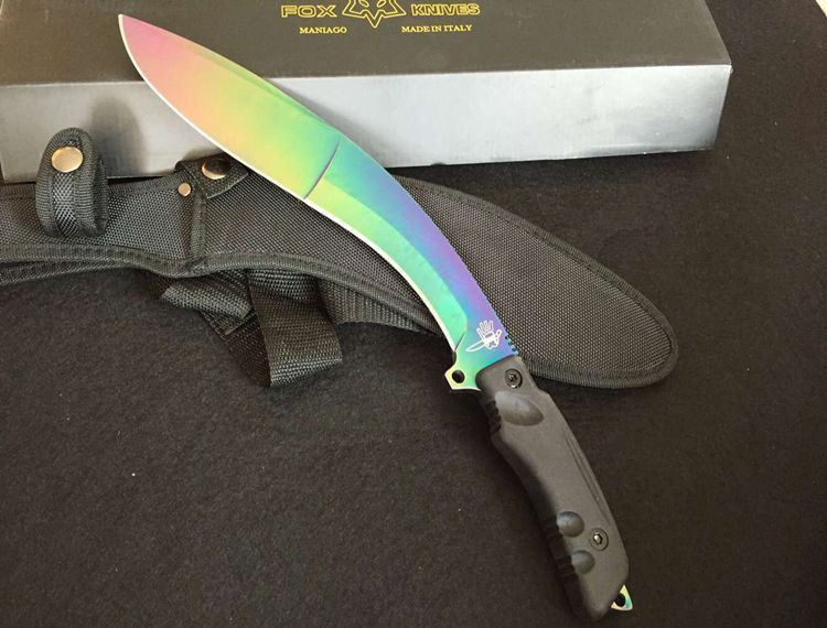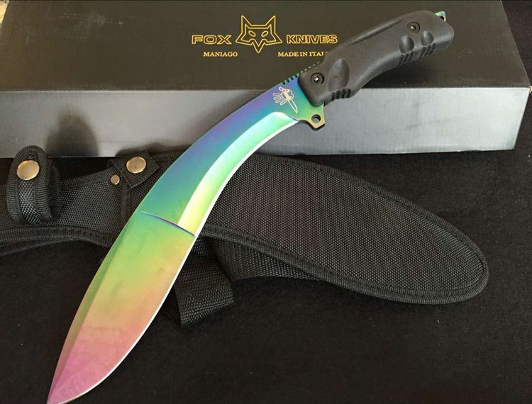 彩钛版黑柄狐狸狗腿刀 全长:39.5cm 刃长:27.5cm 刃宽:4.8cm(最宽处) 刃厚:0.5cm 刃材:440C 硬度:57HRC 表面:镀钛 柄材:橡胶 刀重:500克 总重:810克(含刀套和包装物) 附件:尼龙刀套、挂带