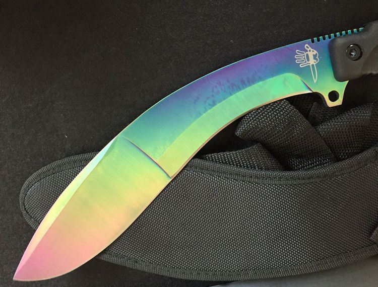 彩钛版黑柄狐狸狗腿刀 全长:39.5cm 刃长:27.5cm 刃宽:4.8cm(最宽处) 刃厚:0.5cm 刃材:440C 硬度:57HRC 表面:镀钛 柄材:橡胶 刀重:500克 总重:810克(含刀套和包装物)