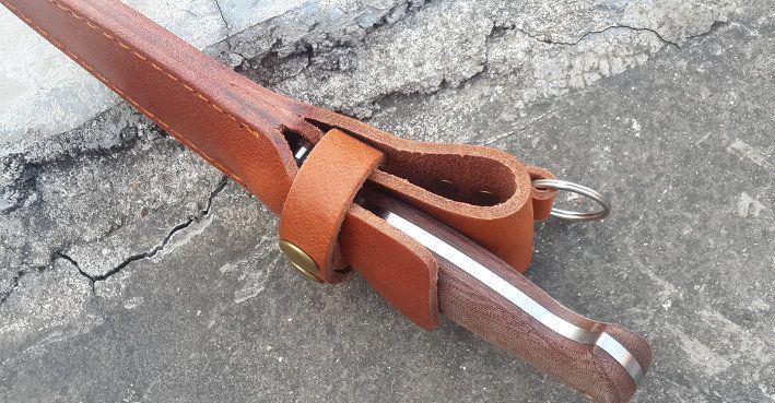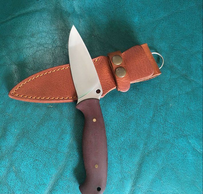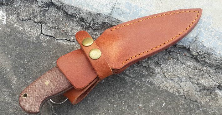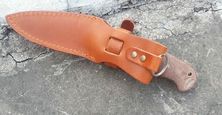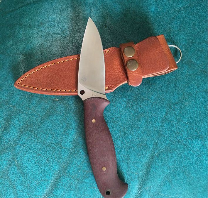 小鲁工蜘蛛直刀 全长:24.8CM 柄长:13CM 刃长:11CM 刃宽:约35mm 刃厚:约4.2mm 刃材:美标D2 柄材:橙色G10和亚麻米卡塔 产品净重:约223g 产品硬度:59-60 表面处理:钢本 附件:进口牛皮套