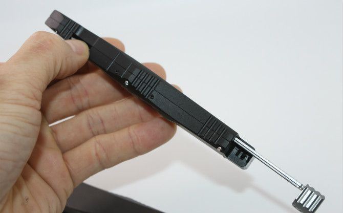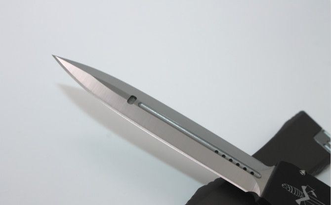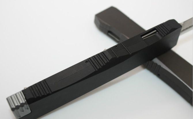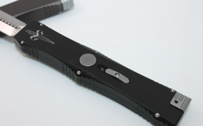美国微技术晕光6号黑柄跳刀 全长:21.5cm 刃长:9cm 刃宽:1.7 cm 刃厚:0.32 cm 刀刃材质:D2 柄材:铝合金 刀型:直跳 锁定类型:按钮锁 +保险 重量:138克(含包装) 附件:尼龙套和彩盒
