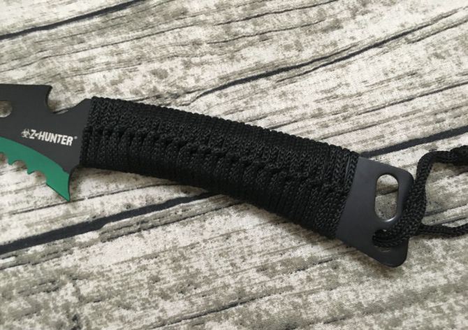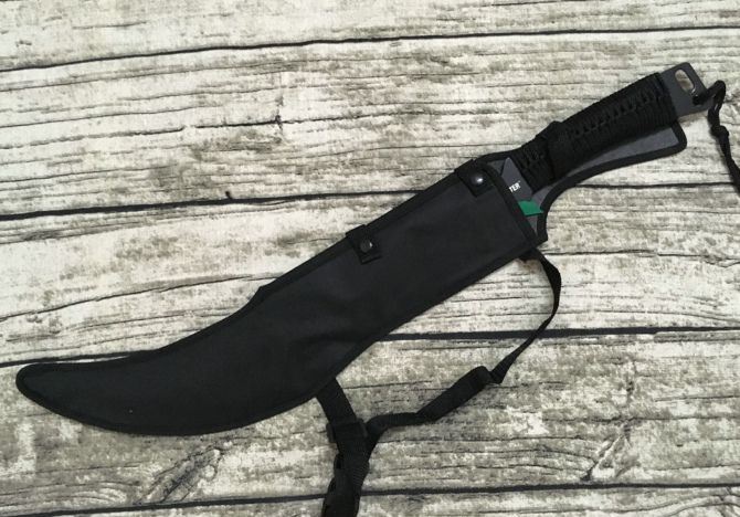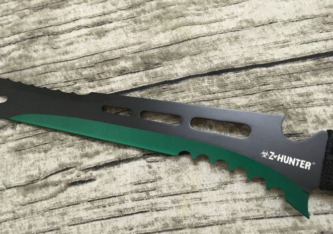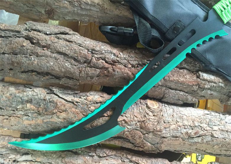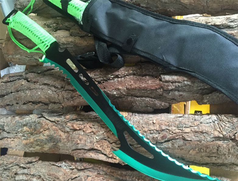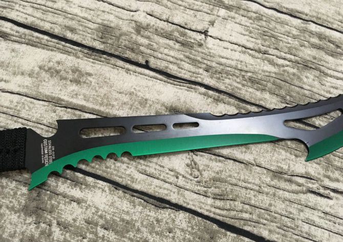 僵尸忍者战刀(绿刃) 全长:61CM 刃长:31.8CM 柄长:16.5CM 刃材:3铬13一体 刀鞘:尼龙 重量:610克