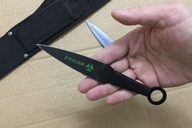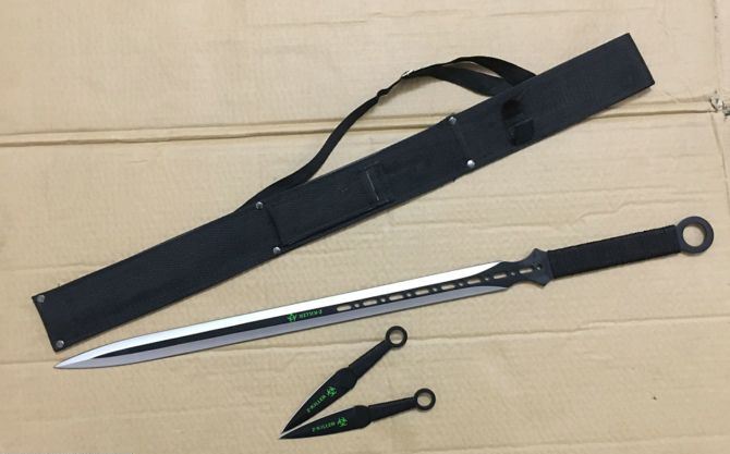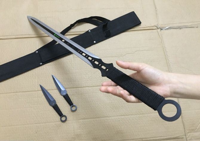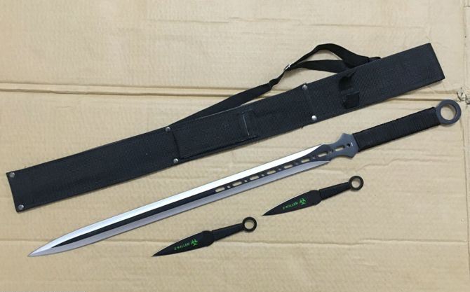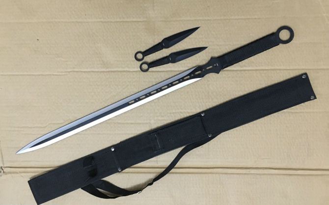 双镖忍者(白刃)忍者战刀 全 长:68.5cm 刃 长:47cm 刃 宽:3.2cm(最宽处) 刃 厚:3mm 柄 长:16.5cm 表 面: 发黑 刃 材: 440 硬 度: 56HRC 柄 材: 绑绳 重 量:500克(含尼龙套、飞镖) 包 装:尼龙套 飞镖尺寸 长:16.5cm 宽:2.5cm 刃 厚:2.8mm 刃 长:8.5cm 柄 长:7cm 表 面: 发黑 刃 材: 440 硬 度: 56HRC 柄 材: 绑绳