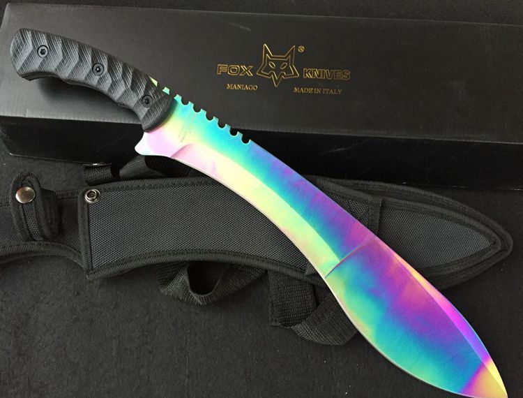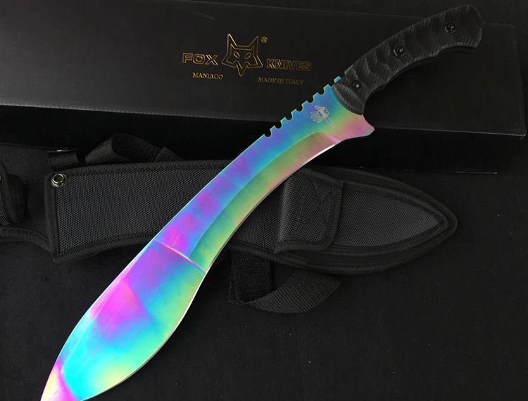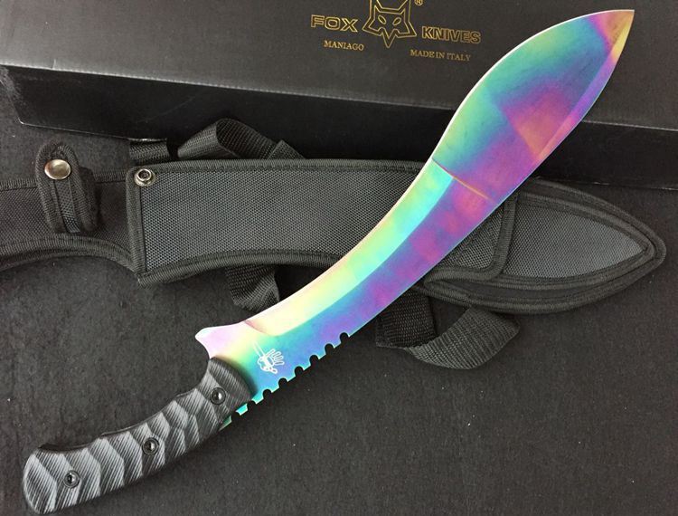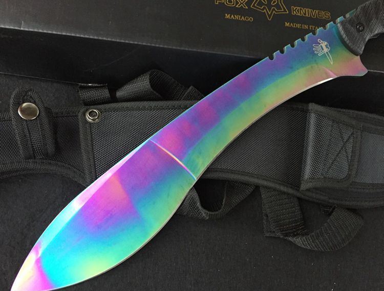 狐狸狗腿彩虹色黑柄加长版 全 长:50cm 刃 长:46cm 刃 宽:7cm(最宽处) 刃 厚:6.2mm 柄 长:13cm 表 面: 高温镀色 刃 材: 5Cr15 硬 度: 58HRC 柄 材: G10防滑柄片 结 构:龙骨一体贯穿整体 包 装:尼农套+彩盒