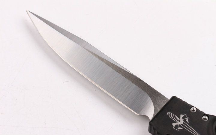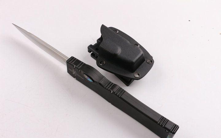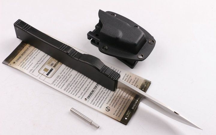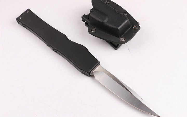 光炫5剑标黑色手工版跳刀 全长:27.0 CM 刃长:11.1CM 刃宽:2.0 CM 刃厚:0.42CM 刀刃材质:ELMAX 柄材:铝合金 刀型:直跳 锁定类型:按钮锁 重量:300克(含包装) 附件:Kydex鞘,说明书,彩盒,送拆刀工具