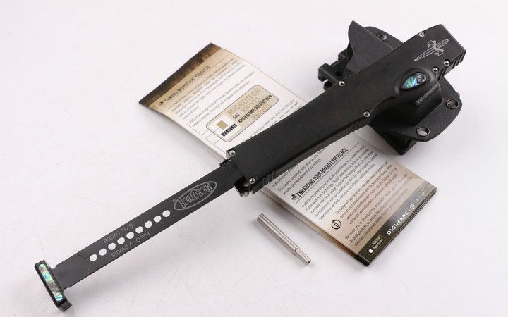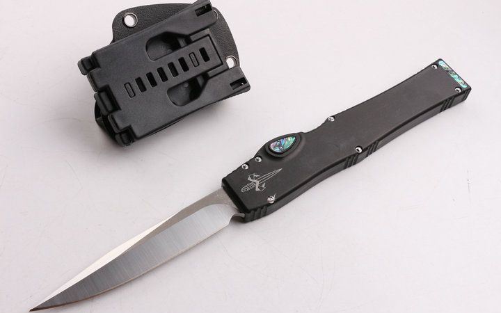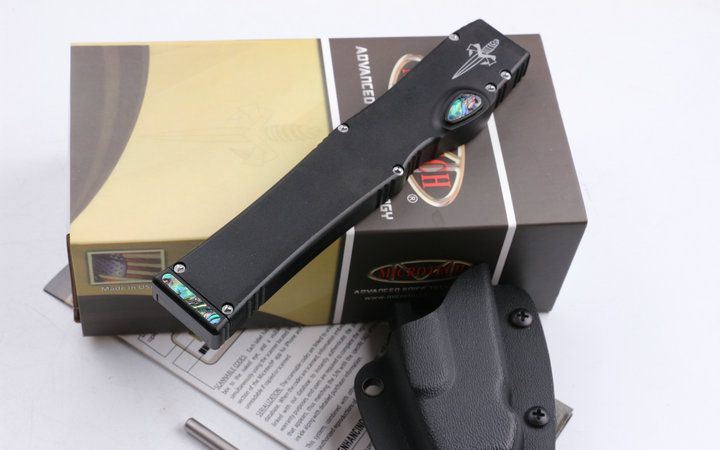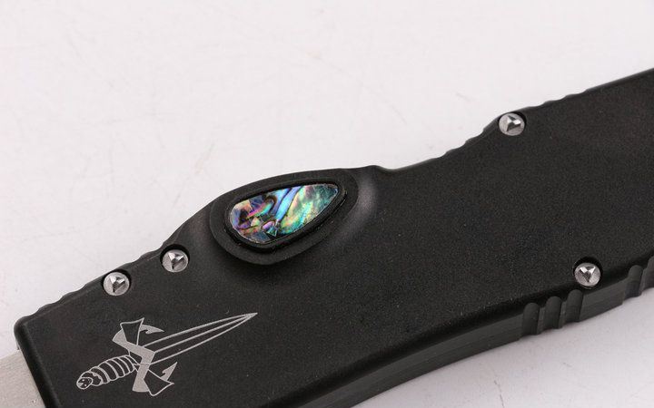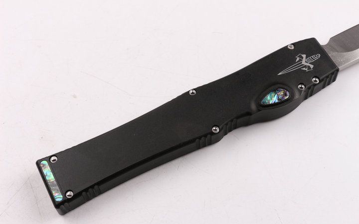 光炫5剑标黑色手工版跳刀 全长:27.0 CM 刃长:11.1CM 刃宽:2.0 CM 刃厚:0.42CM 刀刃材质:ELMAX 柄材:铝合金 刀型:直跳 锁定类型:按钮锁 重量:300克(含包装) 附件:Kydex鞘,说明书,彩盒,送拆刀工具 整刀用CNC,电脑锣,线切割制作而成,手工精密度非常高,绝对不会缩头,开关和刀柄尾端精镶天然鲍由,非常漂亮得体,完美版,很值得收藏的一把刀,数量有限。