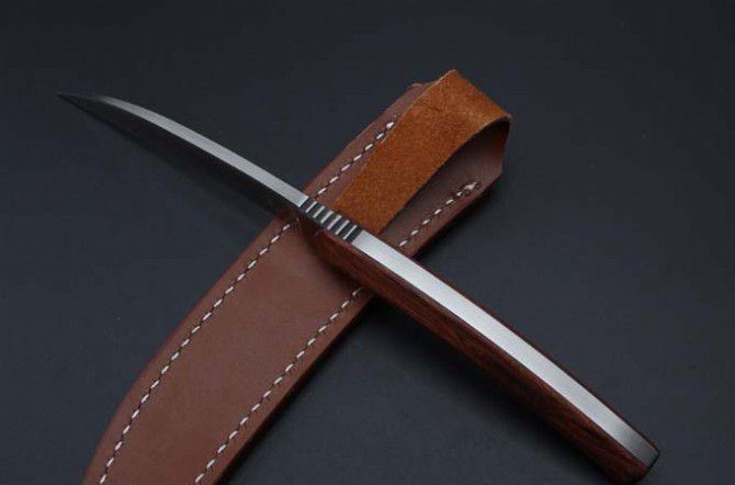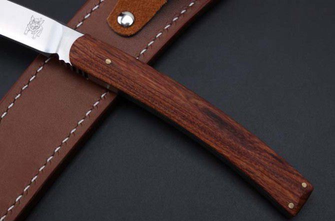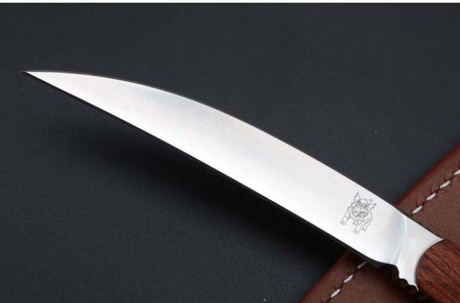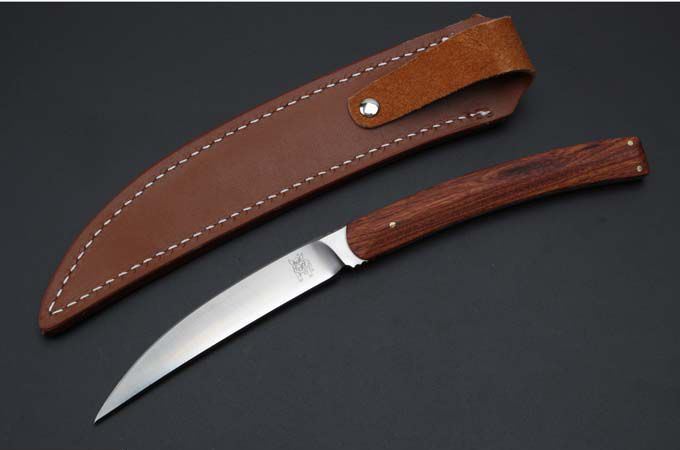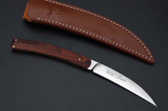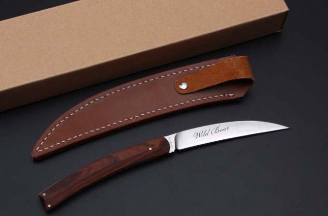 山猪出世直刀 全长:230MM 刃长:103mm 柄长. 108mm 刃厚:5.8mm 刃宽:17mm 刃材: 9Cr18MoV 硬度:60-62HRC 柄材:一体钢+微粒黄檀 进口 牛皮套 净重137克.和包装合275克 刀片手工精细打磨,手工开刃.并且采用真空热处理,硬度达到最佳状态,韧性非常好!同时保持性兼顾.并且保证让您享有如一气冲天的开合感受