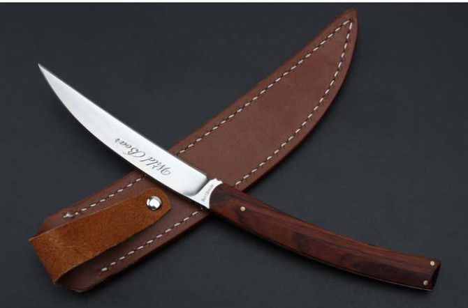 全长:230MM 刃长:103mm 柄长. 108mm 刃厚:5.8mm 刃宽:17mm 刃材: 9Cr18MoV 硬度:60-62HRC 柄材:一体钢+微粒黄檀 进口 牛皮套 净重137克.和包装合275克