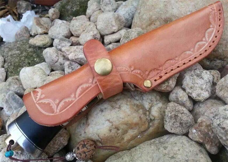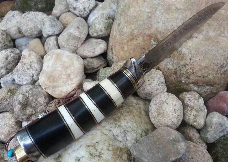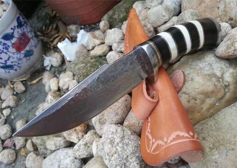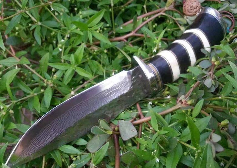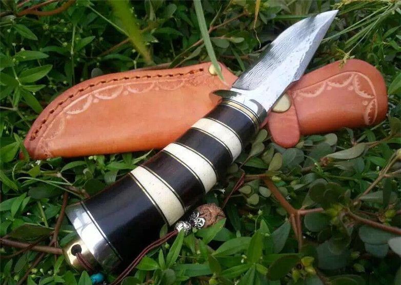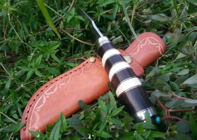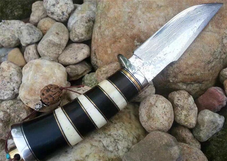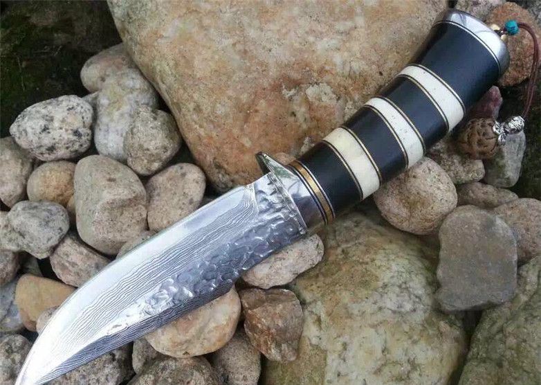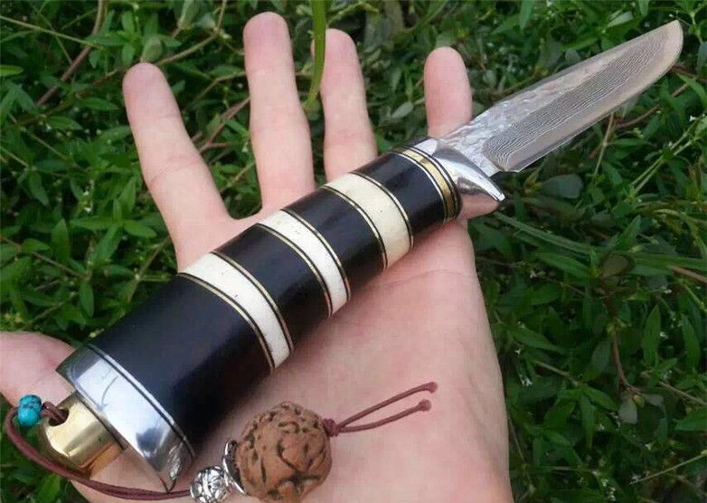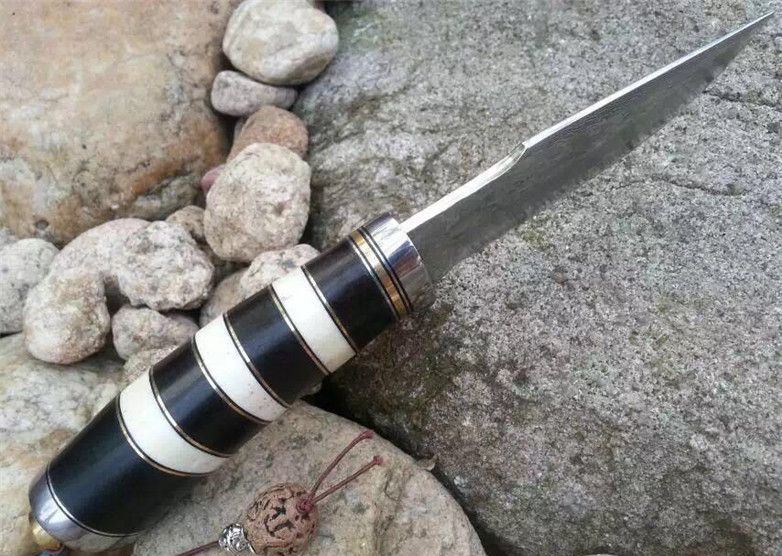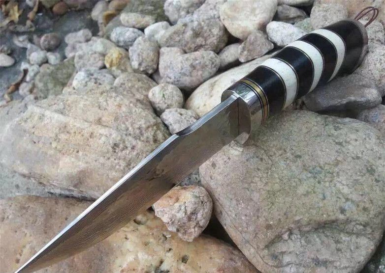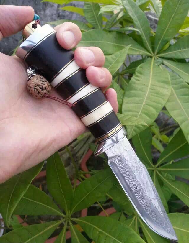 蛇纹大马士革猎刀 全长:22.9cm 刃长:11.5cm 刃宽:3.1cm(最宽处) 柄长:11.4cm 硬度:58-60HRC 刃厚:0.38cm 重约:180克 表面:纯手工制造锻打小浪花纹原色 刃材:正品Vg10大马士革钢 柄材:黑檀木+兽骨+G10+不锈钢+黄铜 配送:高档原装皮套+精美礼品盒+尾绳装饰品 锻打小浪花纹,手柄黑白蛇纹相间,钢护头黄铜尾,大气稳重,收藏把玩极品!