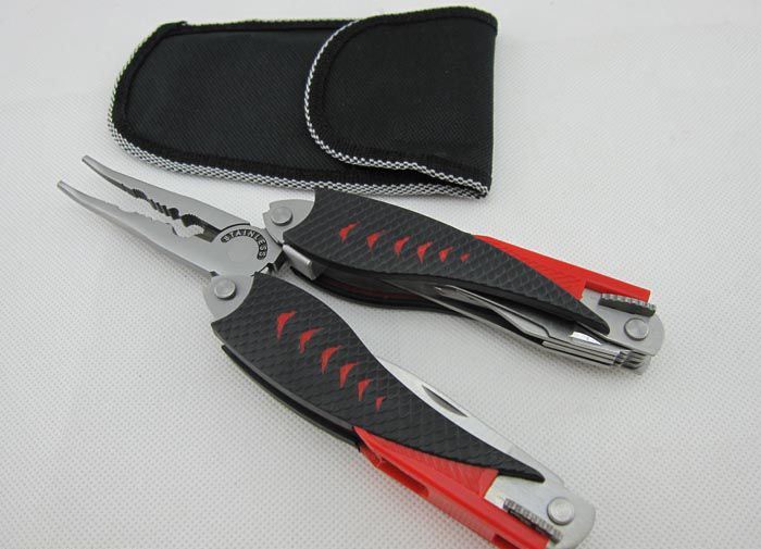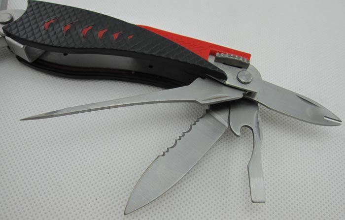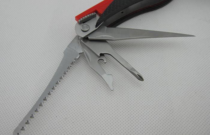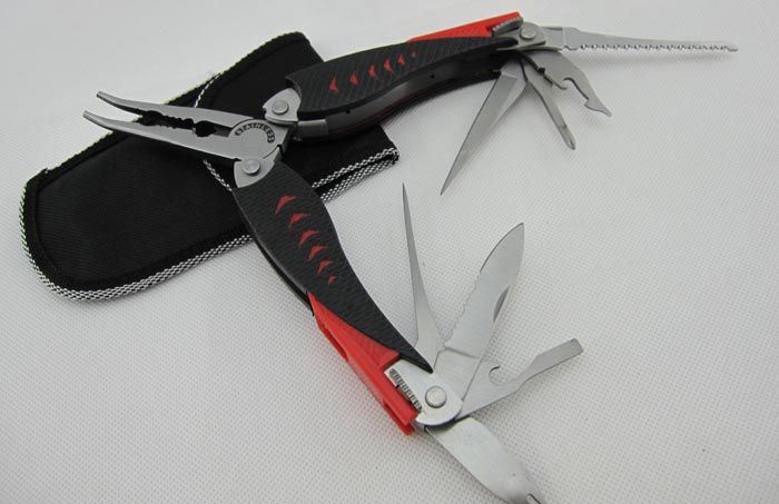折叠长度:12.5cm 总重量:300.0克 材质: 420高级不锈钢; 表面处理:砂光 硬度:54HRC 包装:耐磨尼龙套 【主要部件及功能】 1.钳头:弯嘴钓鱼钳,钢丝钳、牙钳和电线剥皮器 2.利口尖大刀 3.开鱼刀 4.开瓶器兼一字丝批 5.木锯 6.半齿刀片 7.拉丝器 8.锥子 9.十字丝批