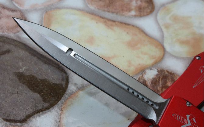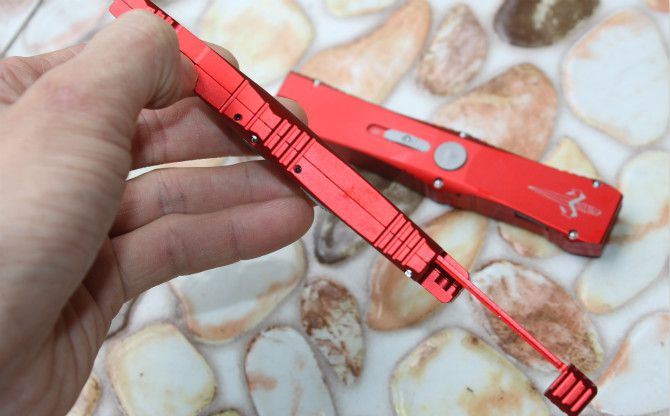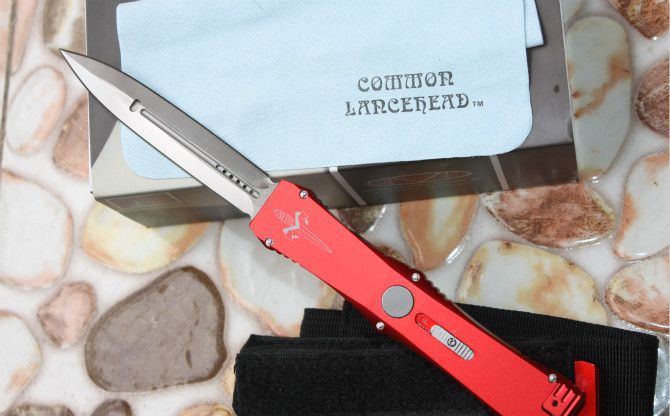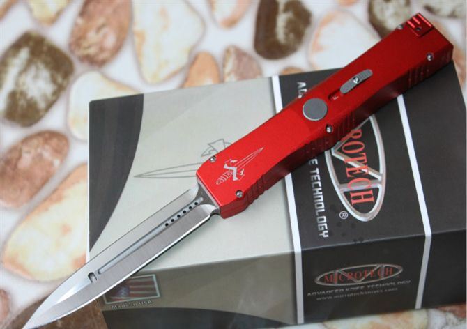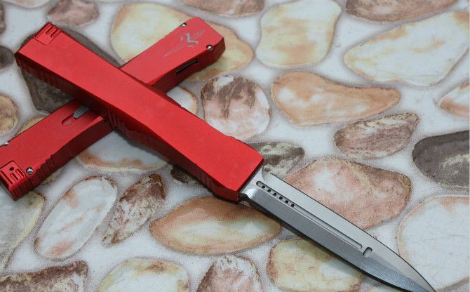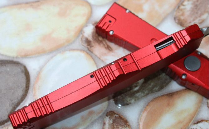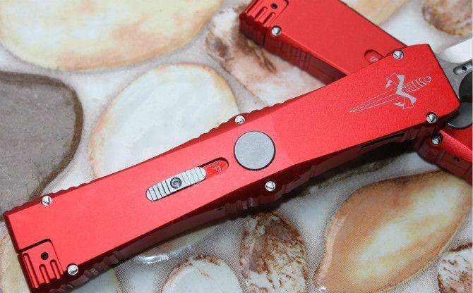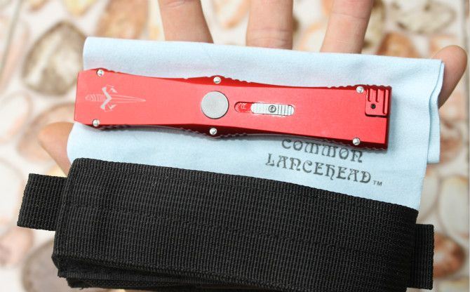 微技术晕光6号(红色柄) 全长:21.5 CM 刃长:9 CM 刃宽:1.7 CM 刃厚:0.32 CM 刀刃材质:D2 柄材:铝合金 刀型:直跳 锁定类型:按钮锁 +保险 重量:138克(含包装) 附件:尼龙套和彩盒