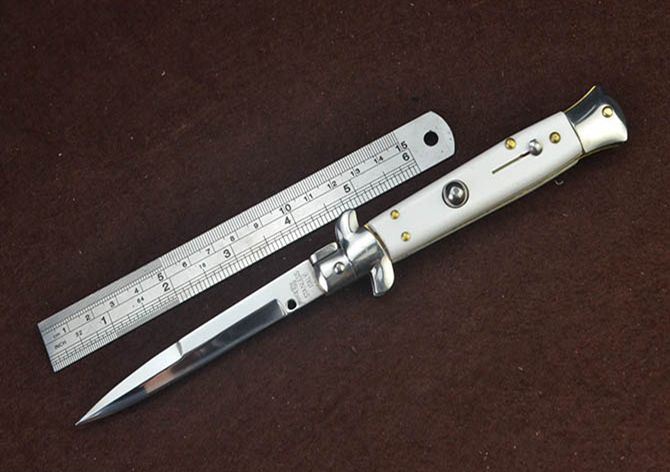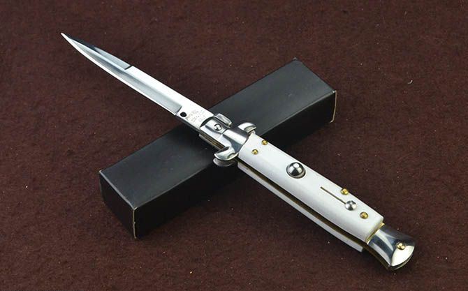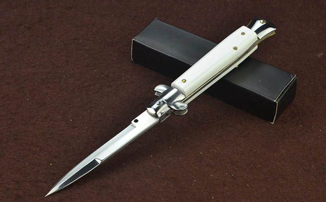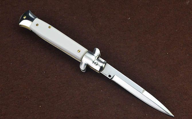 意大利黑手党白柄普通版侧跳刀 全 长: 22.3cm 刃 长: 8.3cm 刃 宽: 1.3cm(最宽处) 闭 合: 12.8cm 硬 度: 54HRC 刃 厚: 0.3cm 表 面: 镜光 刃 材: 440 柄 材: 双钢头+亚克力 重 量: 103克 锁 闭: 弹簧安全锁