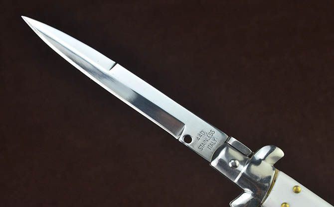 意大利黑手党白柄普通版侧跳刀 全 长: 22.3cm 刃 长: 8.3cm 刃 宽: 1.3cm(最宽处) 闭 合: 12.8cm 硬 度: 54HRC 刃 厚: 0.3cm 表 面: 镜光 刃 材: 440 柄 材: 双钢头+亚克力 重 量: 103克
