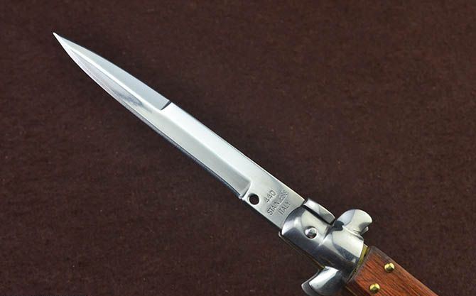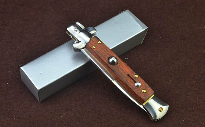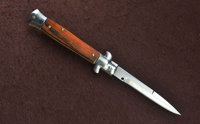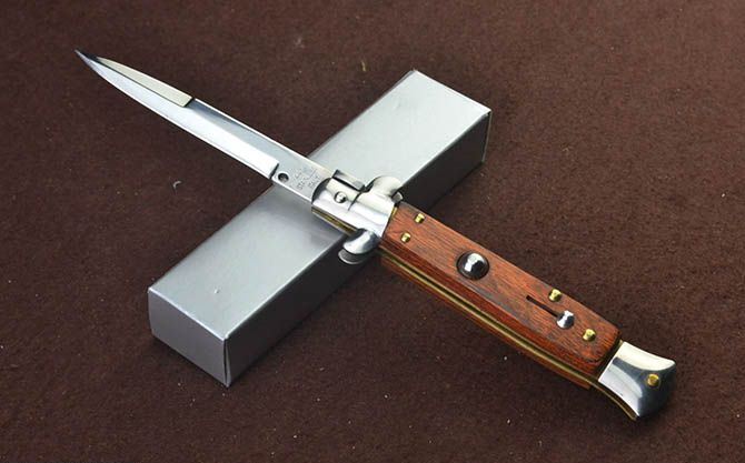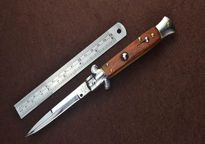 意大利黑手党红木柄普通版侧跳刀 全 长:22.9CM 刃 长:10.2CM 柄 长:325MM 刃 厚:3.0mm 刃 材:440 刀 柄:彩木柄 开刀方式:弹簧 重 量:150克 枪刺刃的黑手党侧跳,力克柄,弹力超强,锁定到位,刃镜面,带有保险装置,刀护手处暗藏闭合开关,出口产品,质量保证!满足把玩和收藏需要