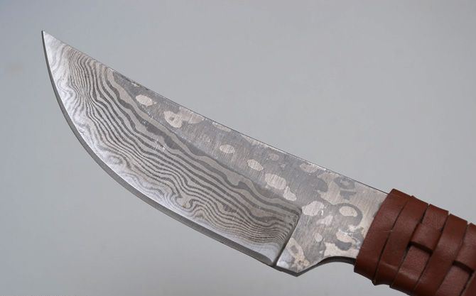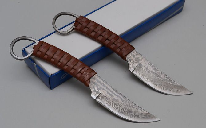 花纹钢绑皮爪刀 全 长: 21.5cm 刃 长: 8cm 刃 厚: 4.1mm 刃 宽: 2.7cm 刃 材: 440 柄 长: 12cm 硬 度: 57HRC 净 重: 120g 毛 重: 171g(含皮套及包装) 表 面: 仿大马士革