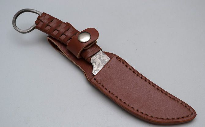花纹钢绑皮爪刀 全 长: 21.5cm 刃 长: 8cm 刃 厚: 4.1mm 刃 宽: 2.7cm 刃 材: 440 柄 长: 12cm 硬 度: 57HRC 净 重: 120g 毛 重: 171g(含皮套及包装) 表 面: 仿大马士革 柄 材: 全钢+绑真皮