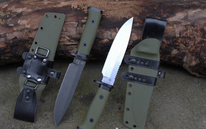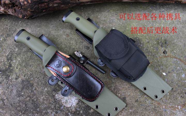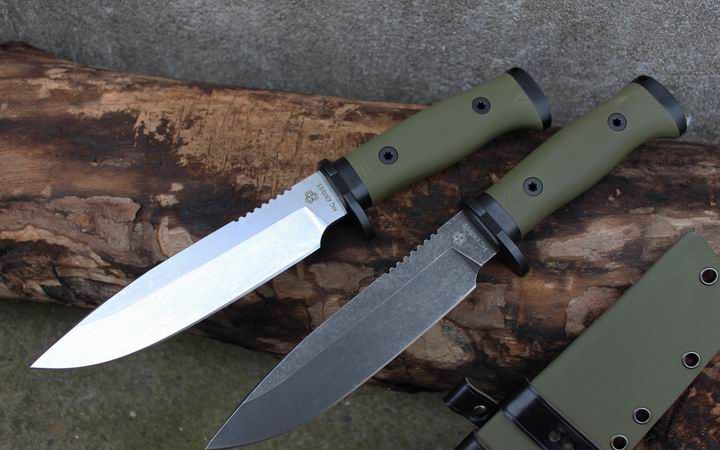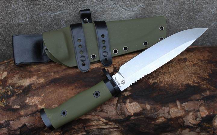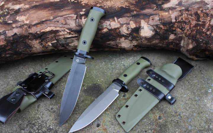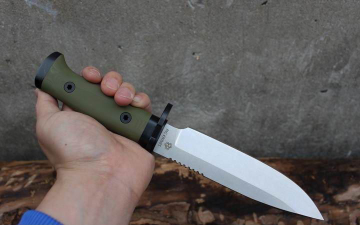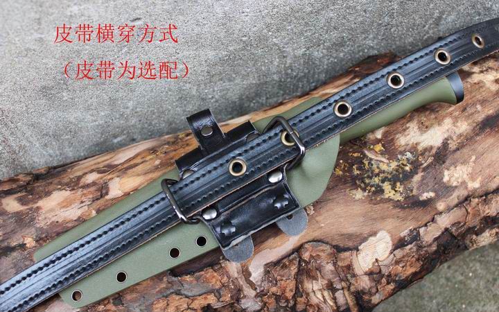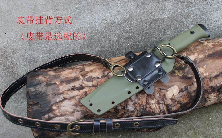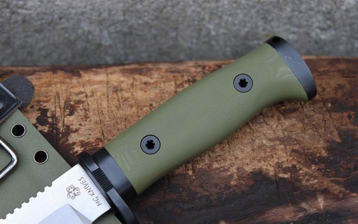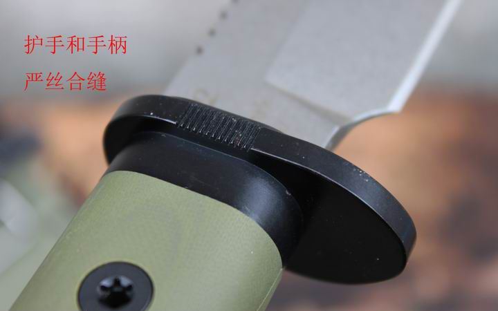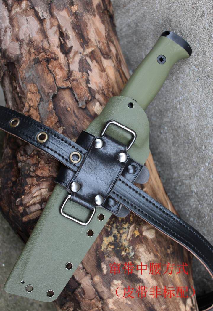 丛林实战专家户外生存刀 钢材:德国D2 硬度:60 HRC 热处理:D2钢标准热处理,回火两次,韧性标准弯曲25度不断 刃长:17.3 厘米 全长:29.7 厘米 刃厚:0.5厘米 重量: 450克(不含鞘重,连鞘总重590克) 表面处理:沧桑石洗/ 珠光石洗 刀鞘:丛林绿色KYDEX鞘 + 头层牛皮挂扣 (或者可以换配K夹,请与客服联系确认) 手柄:不锈钢护手发黑件;不锈钢尾椎发黑件; 丛林绿G10包围式夹片;抗震12级合金钢螺丝件 包装:硬纸盒