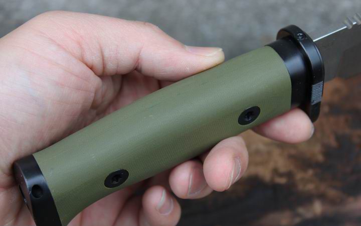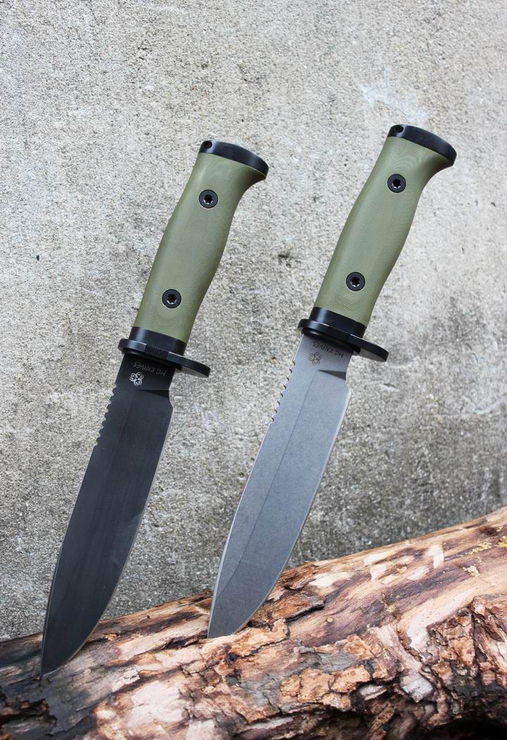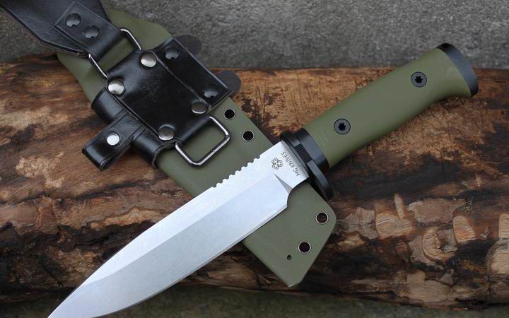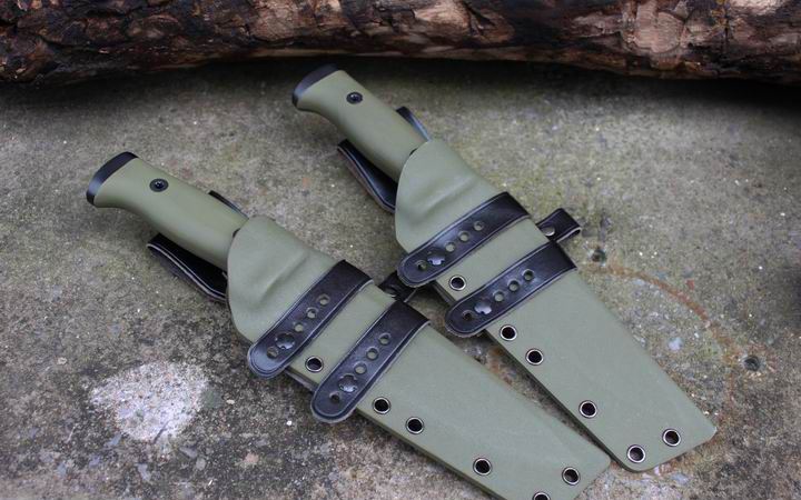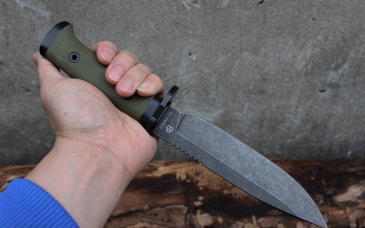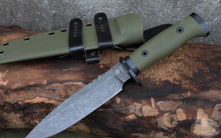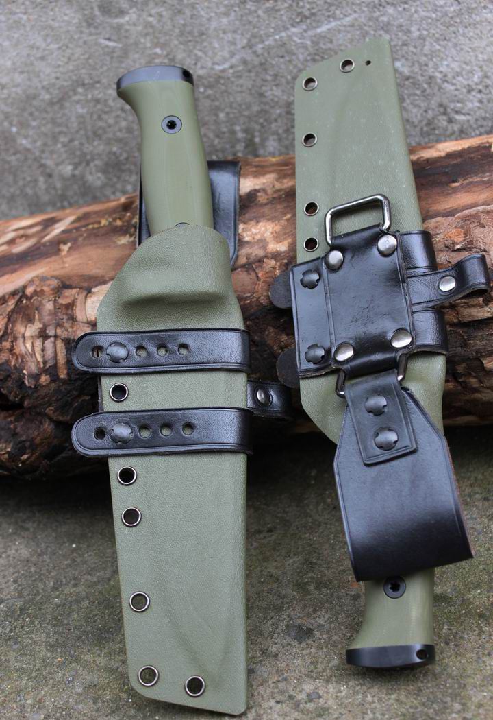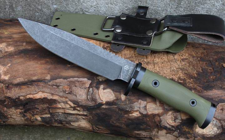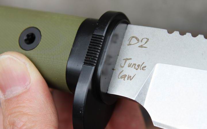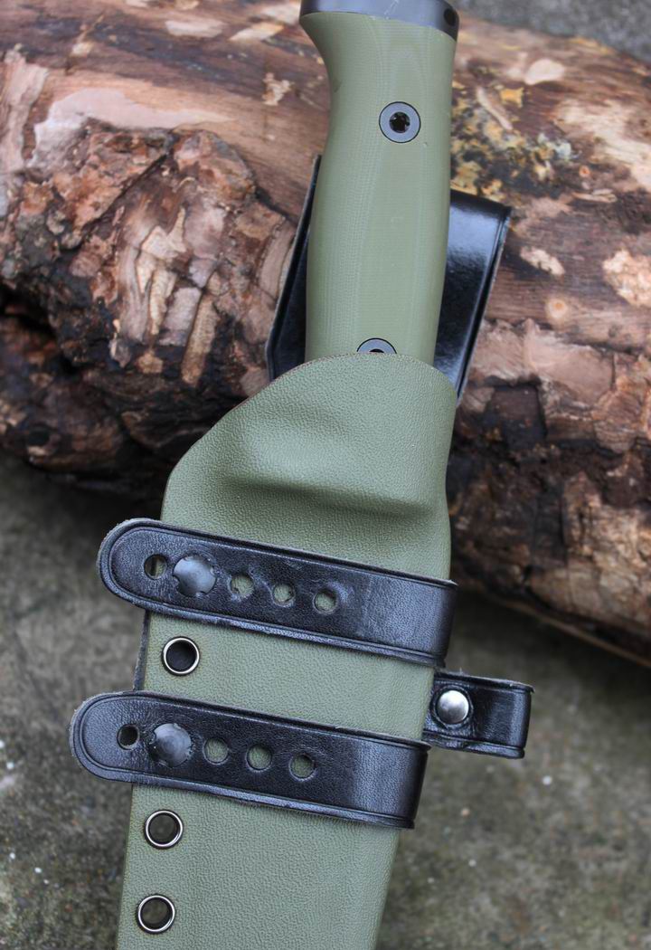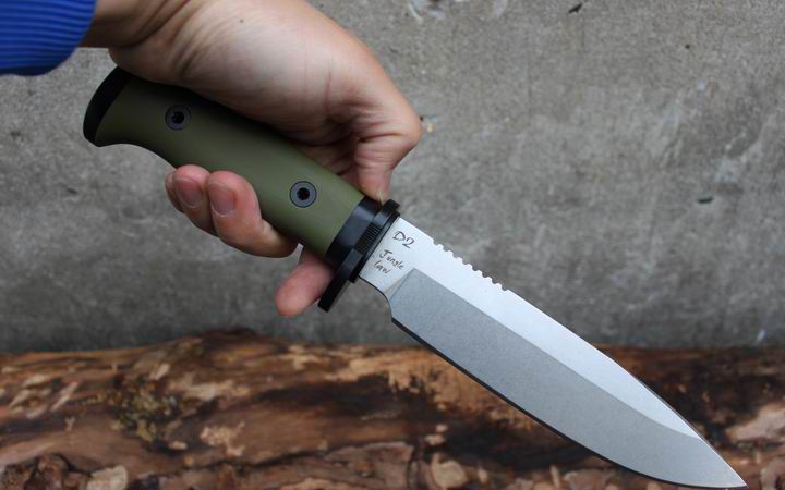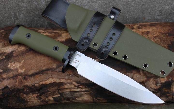 丛林实战专家户外生存刀 钢材:德国D2 硬度:60 HRC 热处理:D2钢标准热处理,回火两次,韧性标准弯曲25度不断 刃长:17.3 厘米 全长:29.7 厘米 刃厚:0.5厘米 重量: 450克(不含鞘重,连鞘总重590克) 表面处理:沧桑石洗/ 珠光石洗 刀鞘:丛林绿色KYDEX鞘 + 头层牛皮挂扣 (或者可以换配K夹,请与客服联系确认) 手柄:不锈钢护手发黑件;不锈钢尾椎发黑件; 丛林绿G10包围式夹片;抗震12级合金钢螺丝件