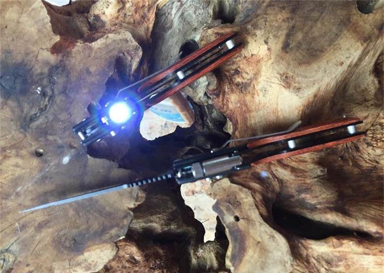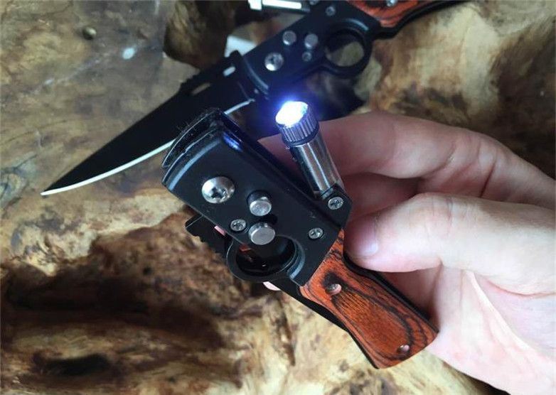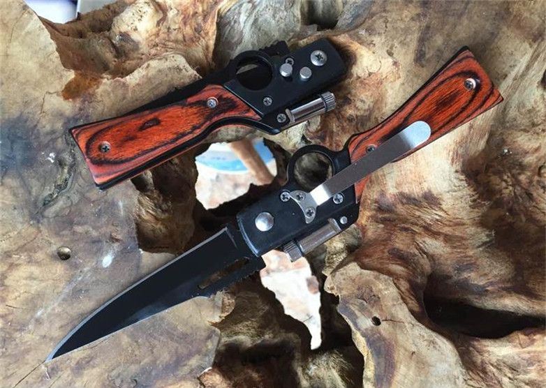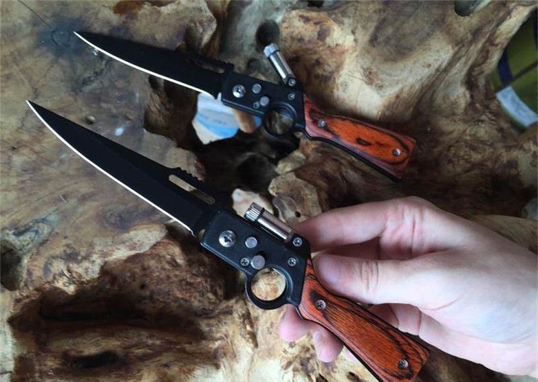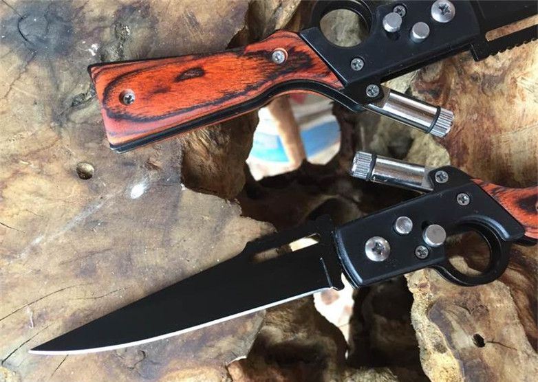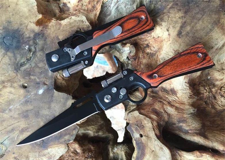 AK枪形弹簧刀(小号黑色) 全长:20cm 刃长:8.5cm 硬度:56HRC 刃厚:0.2cm 刃材:3铬13 柄材:彩木