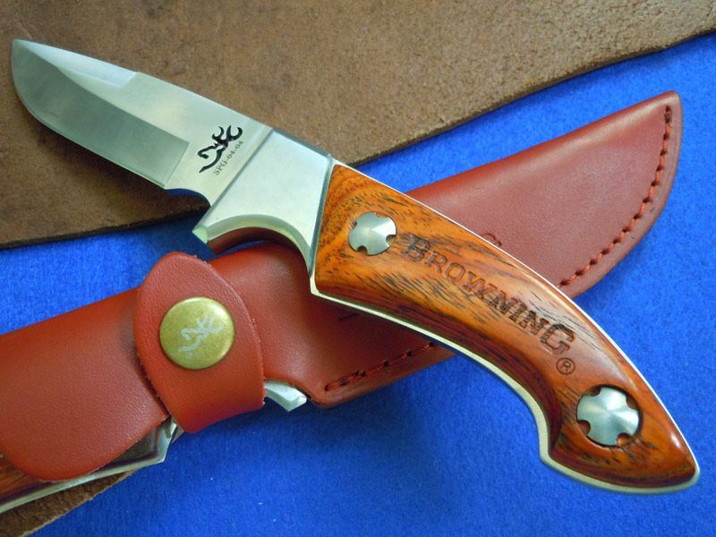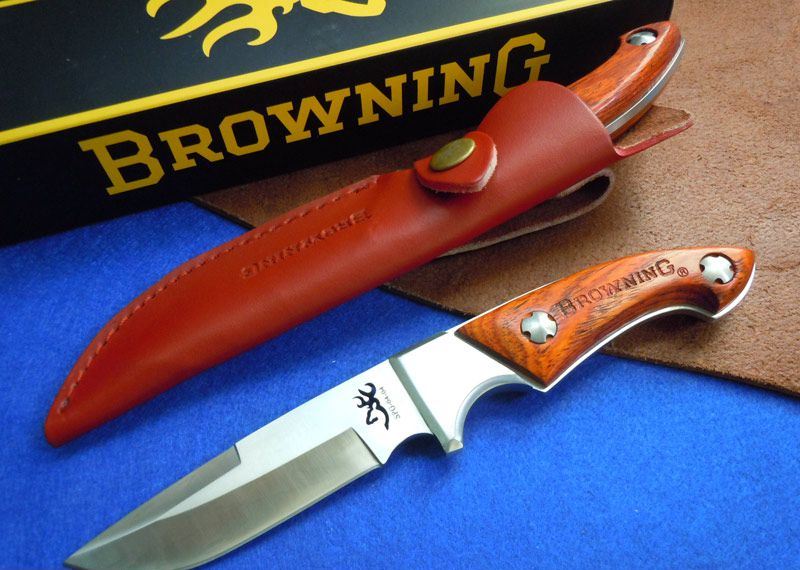 勃朗宁049狩猎刀 全长:21.5 刃长:9.5 柄长:11.5 刃材料:7铬17(440) 柄材料:花梨实木 重量:210克 刀鞘:牛皮 包装:原装纸盒包装