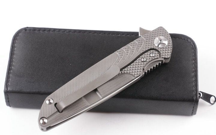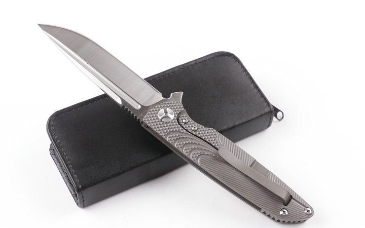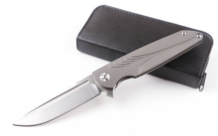 2015亚特兰大获奖刀台风折刀(灰钛D头) 全长:228mm 刃长:100mm 柄长:128mm 刃宽:25mm 刃厚:4.0mm 刃材:D2(深冷处理) 重量:245g(含包装) 硬度:58-60HRC 表面:砂光拉丝 柄材:手柄全TC4钛合金CNC加工表面雕花。 刀夹:TC4钛合金 螺丝:所有的螺丝420不锈钢硬度HRC45,全CNC精雕加工。 结构:一体线锁,陶瓷定位珠,内置双排滚珠轴承 其他:礼品盒