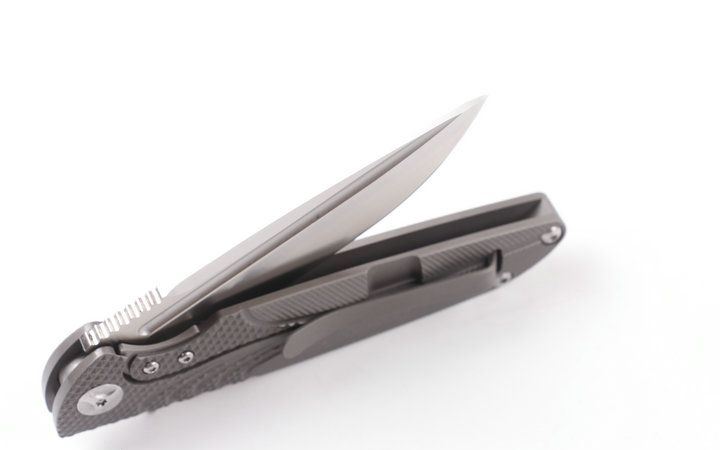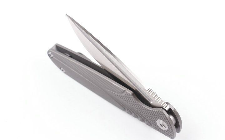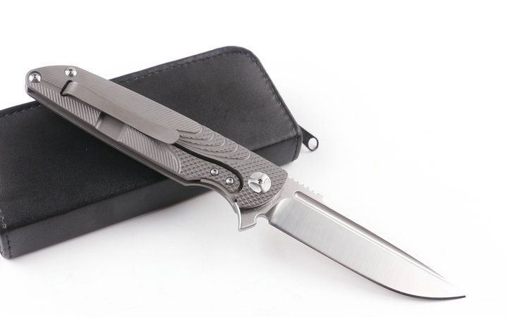 2015亚特兰大获奖刀台风折刀(灰钛D头) 全长:228mm 刃长:100mm 柄长:128mm 刃宽:25mm 刃厚:4.0mm 刃材:D2(深冷处理) 重量:245g(含包装) 硬度:58-60HRC 表面:砂光拉丝 柄材:手柄全TC4钛合金CNC加工表面雕花。 刀夹:TC4钛合金 螺丝:所有的螺丝420不锈钢硬度HRC45,全CNC精雕加工。 结构:一体线锁,陶瓷定位珠,内置双排滚珠轴承