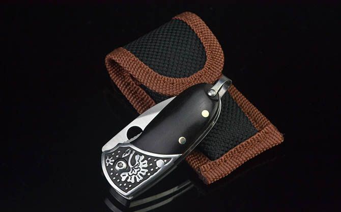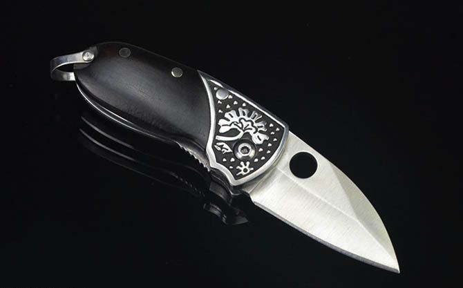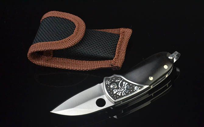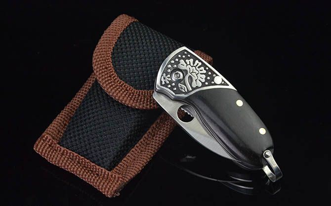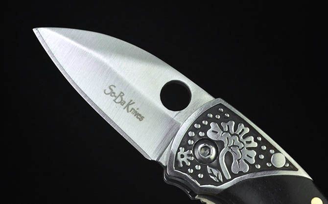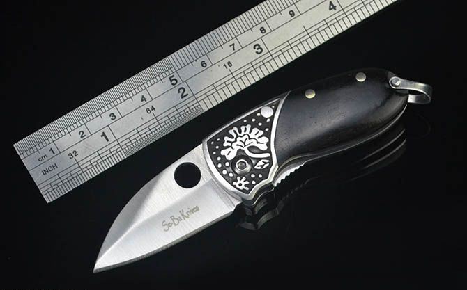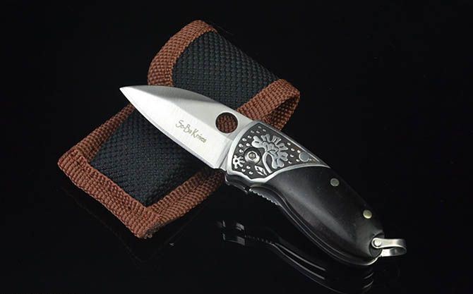 沙巴小Q折刀 全 长:10cm 刃 长:4cm 刃 宽:2.1cm(最宽处) 刃 厚:2.1mm 刃 面:砂光 刃 材: 3Cr13 硬 度: 56HRC 柄 长:5.8cm 柄 材:全钢雕花+黑檀木 重 量:56克(含包装) 包 装:尼龙套