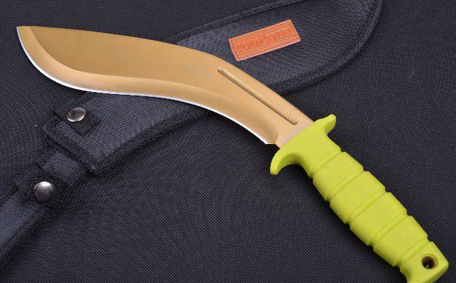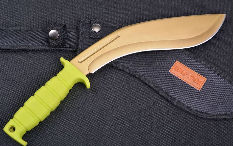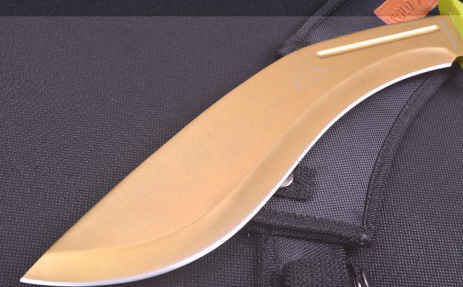 冷钢战俘金狗腿弯刀 全 长: 39.5cm 刃 长: 27cm 柄 长: 13cm 刃 厚: 6mm 刃 材: 不锈钢 硬 度: 58HRC 重 量: 650g 表 面: 镀金钛 柄 材: ABS