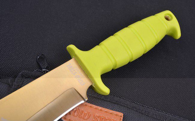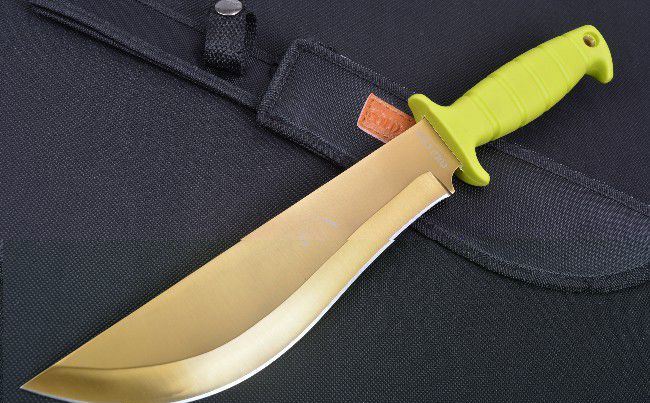 冷钢开拓者金色砍刀 全 长:37cm 刃 长:24cm 柄 长:13cm 刃 厚:6mm 刃 材:440C 硬 度:58HRC 重 量:650g 表 面:镀金 柄 材:ABS 刀 鞘:尼龙
