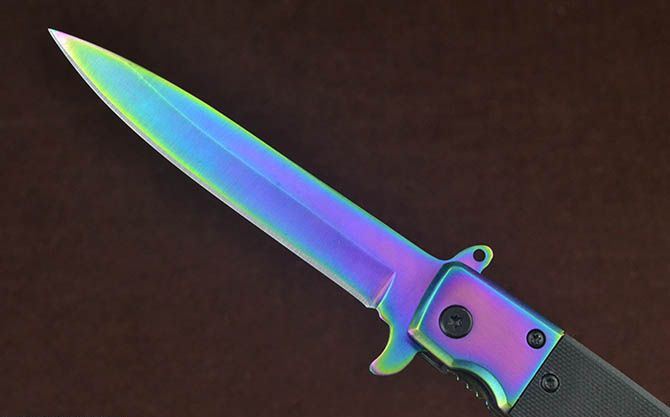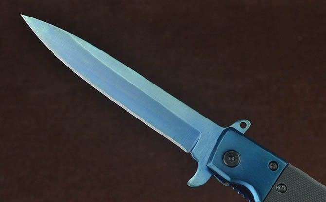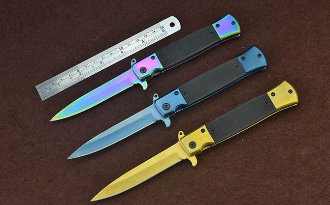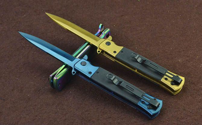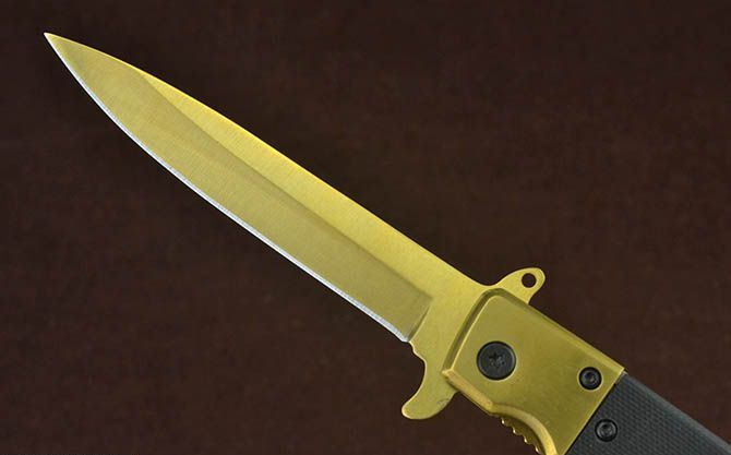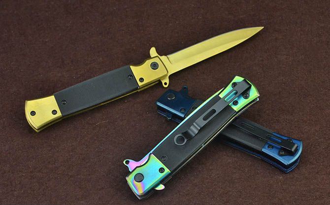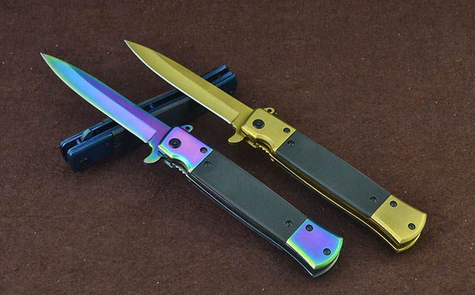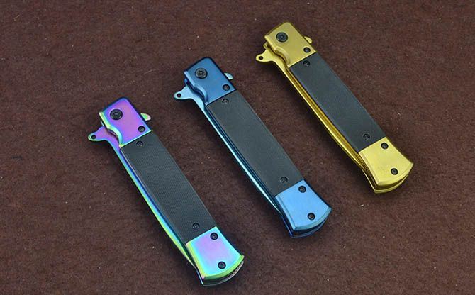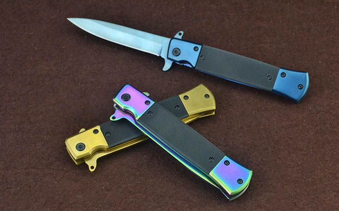 新版SOG931战术快开折刀(金、蓝、彩) 全 长:22cm 刃 长:9.5cm 柄 长:12cm 刃 宽:1.7cm 刃 厚:2.8mm 刃 材:3Cr13Mov 重 量:148g 硬 度:56HRC 表 面:金色/蓝色/幻彩 柄 材:双钢头+G10 锁 型:线锁